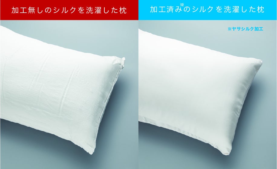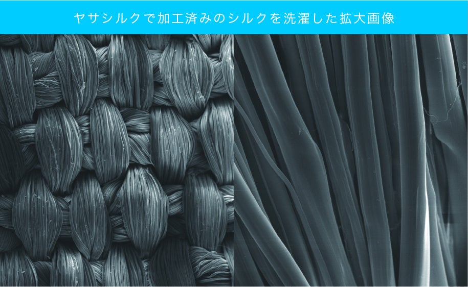 今回開発した加工技術「YasaSilk(ヤサシルク)」は、シルク生地を家庭用洗濯機で60回洗っても、シルク最大の弱点である湿摩擦により発生するスレをほとんど起こさず、縮みも非常に少なく、色落ちもほとんど無いという性能を、織り上がった生地での加工により実現したことが大きな特徴です。