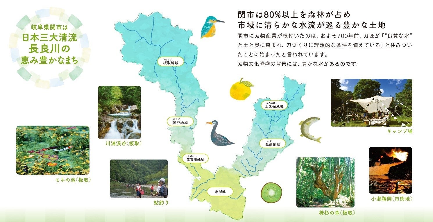 700余年前、関の地が、日本刀の産地として隆盛を極めた理由は「“良質な水”と土と炭に恵まれ、刀づくりに理想的な条件を備えている」と一人の刀匠が住みついたことに始まったと言われています。刃物文化隆盛の背景には、豊かな水があるのです。関市は80%以上を森林が占め、近年ではフランスの画家モネの名画「睡蓮」にそっくりとSNSで話題の通称「モネの池」など、美しい自然にも注目されています。