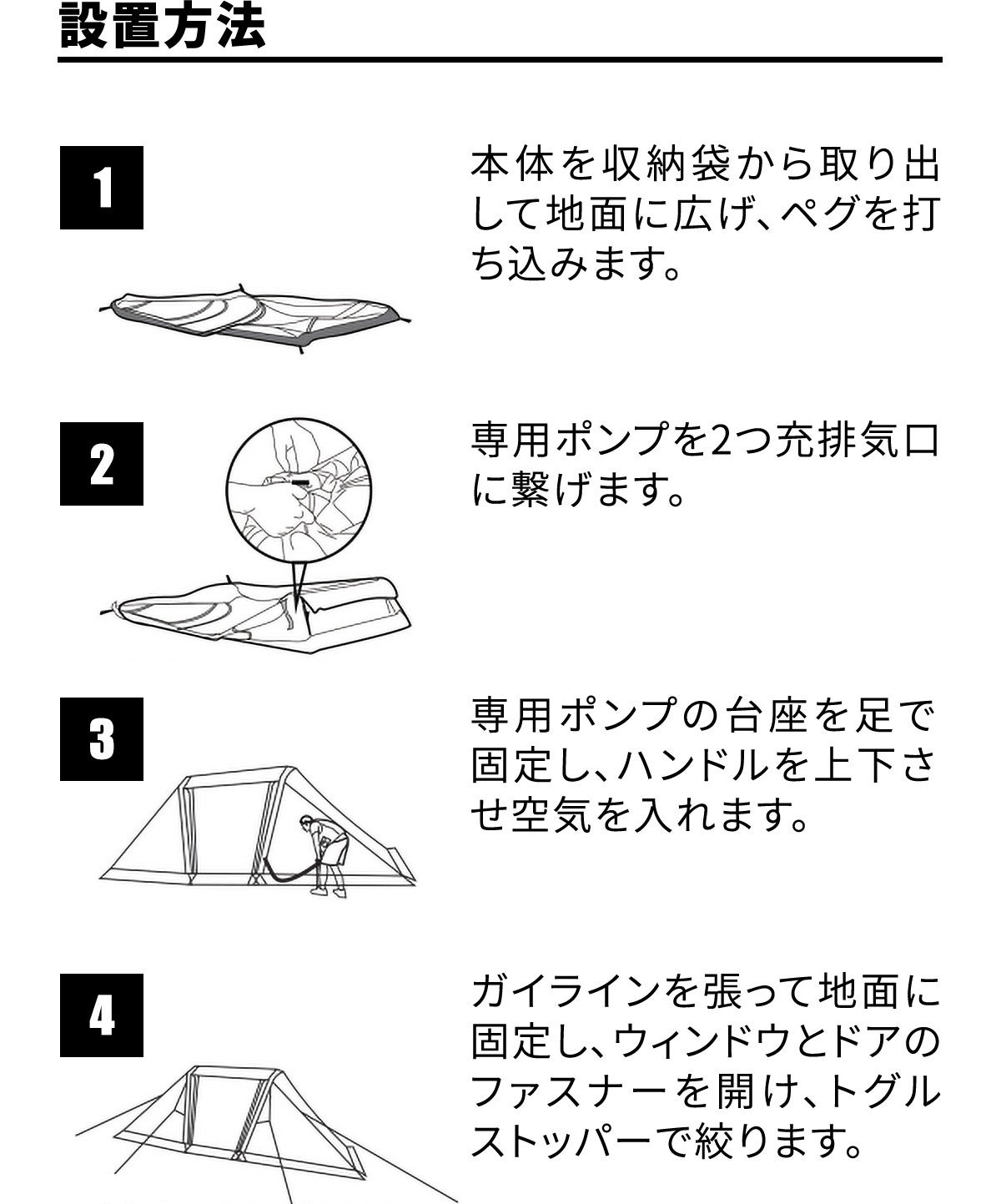 付属品:エアポンプ収納袋×1、エアポンプ×1、インナーマット×1、インナーテント内仕切り幕×1、インナーテント×1、収納袋×1、ペグ収納袋×1、夜光性テントペグ×23、ガイライン×8、取扱説明書×1