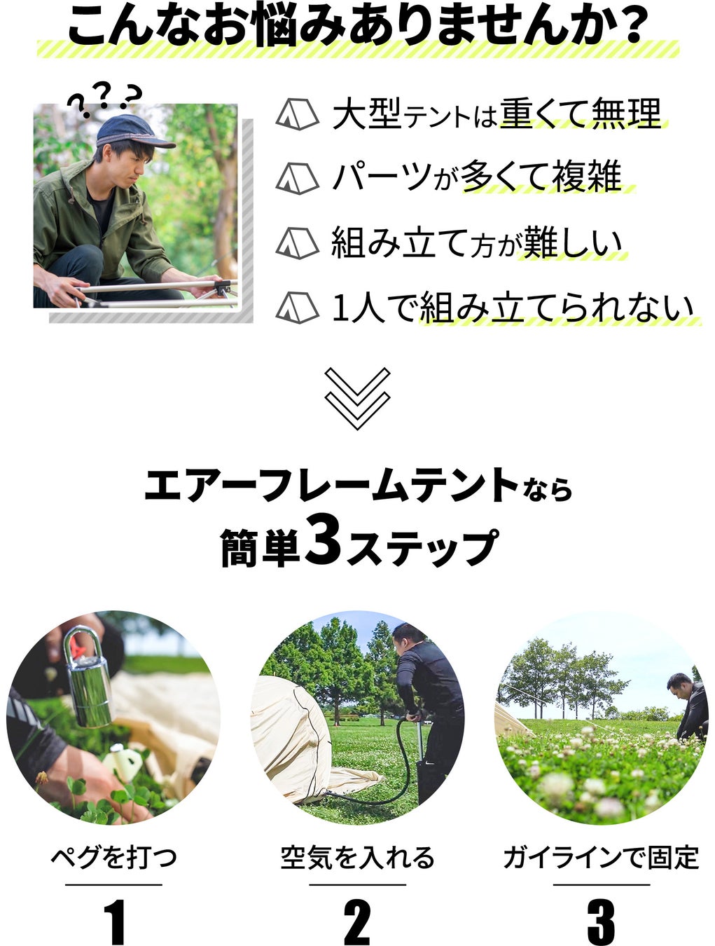 エアポンプで空気を送り込むことで自立するので、2、3人がかりで大変だったテントの設営が、一人でも簡単にできます。