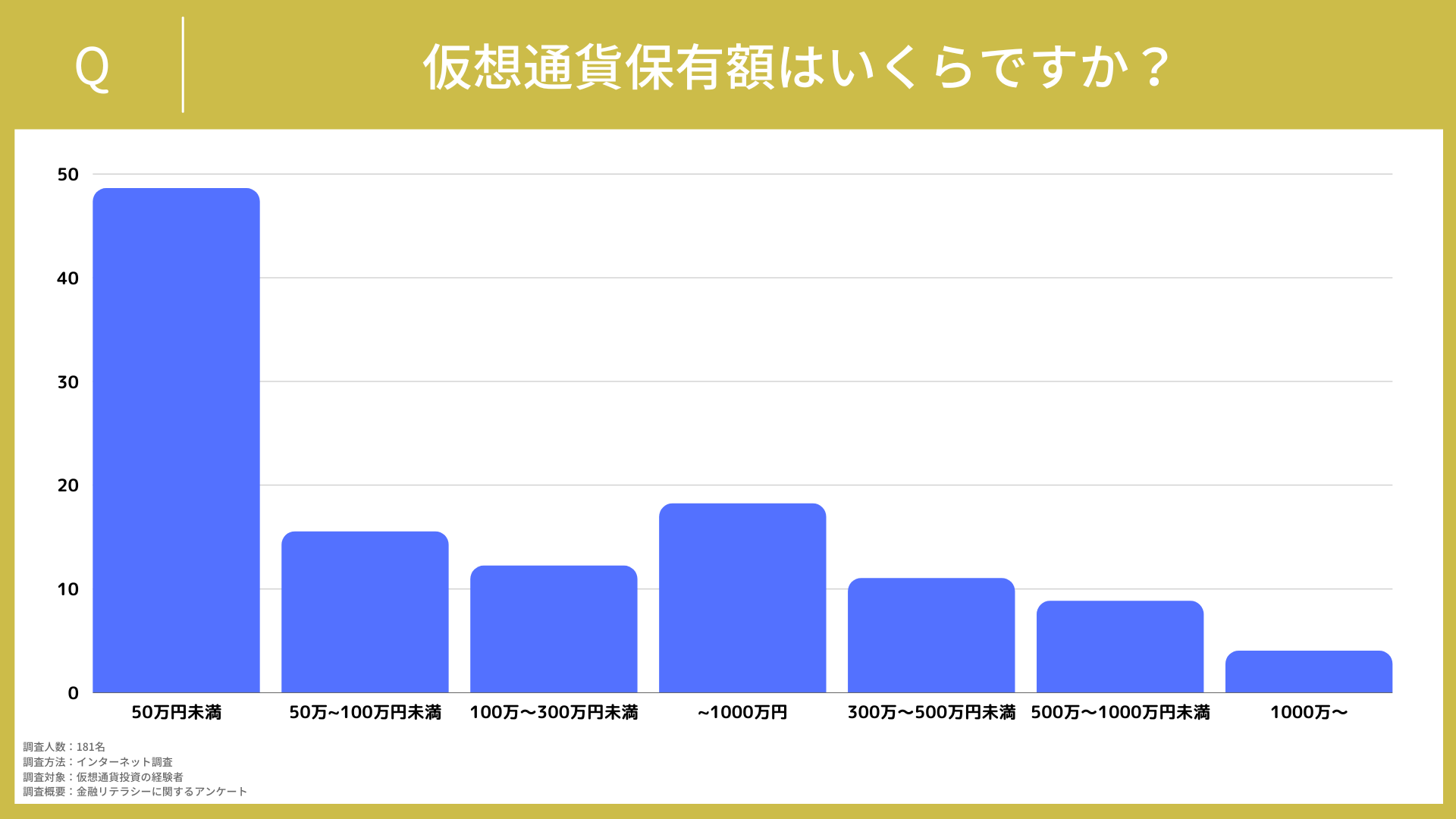 - 仮想通貨の保有額は50万円以下が最も多く50%近い数字