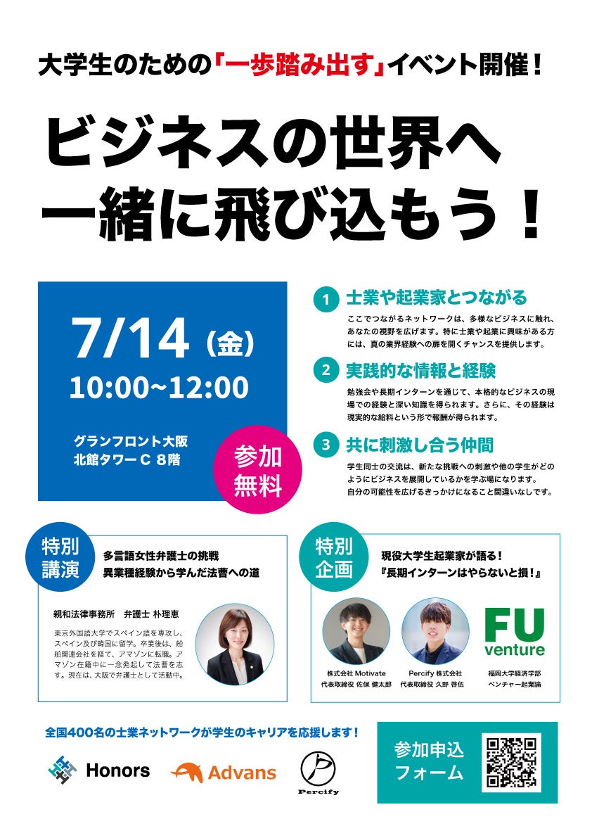 7月14日、グランフロント大阪にて難関資格を目指す学生、起業に興味がある学生、キャリアについて迷っている全ての大学生に向けて「士業の魅力や現状」「学生起業のリアル」を追体験できるイベントを開催します!