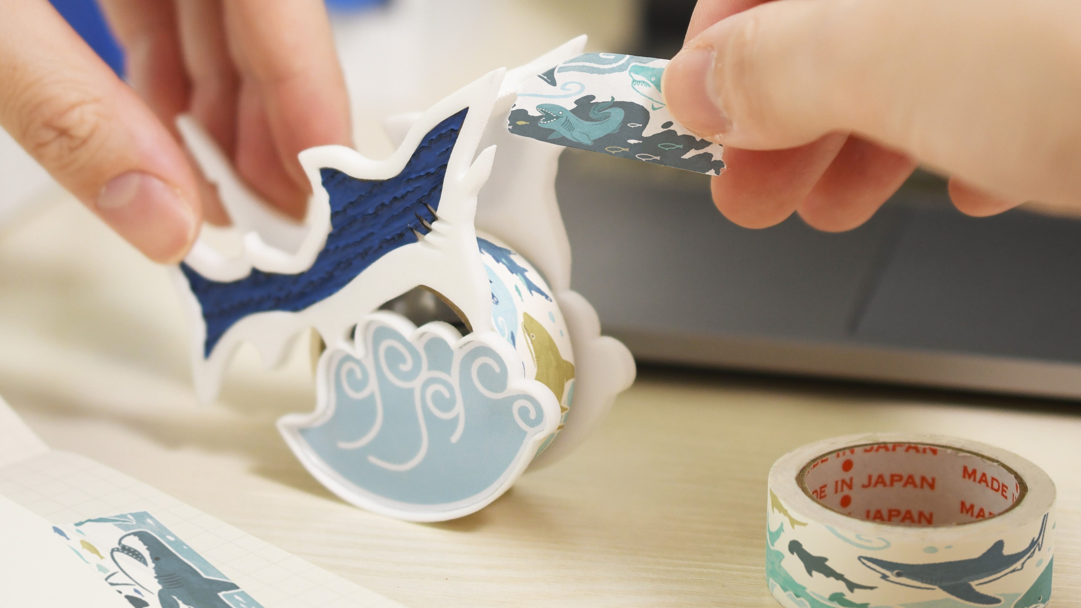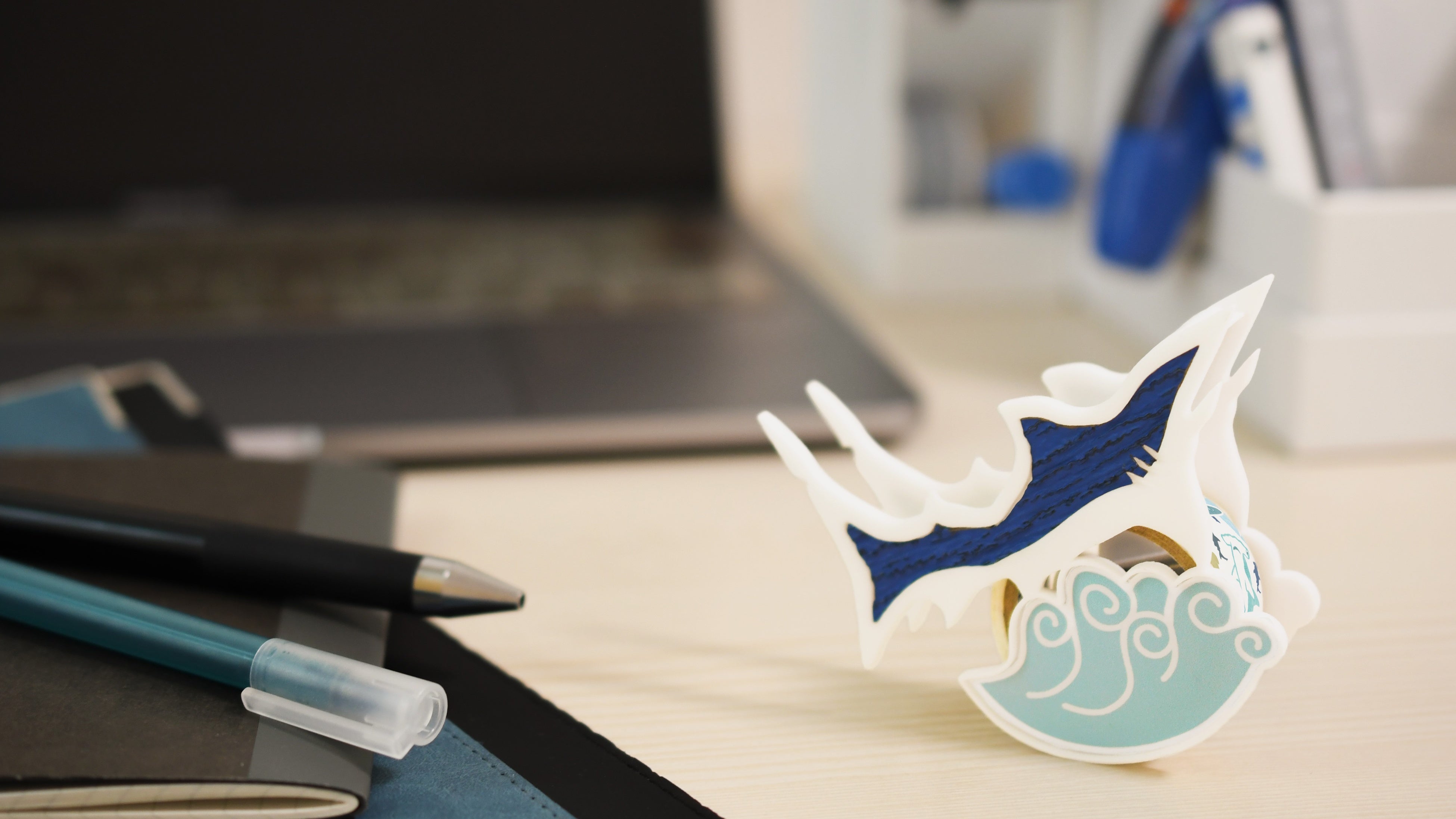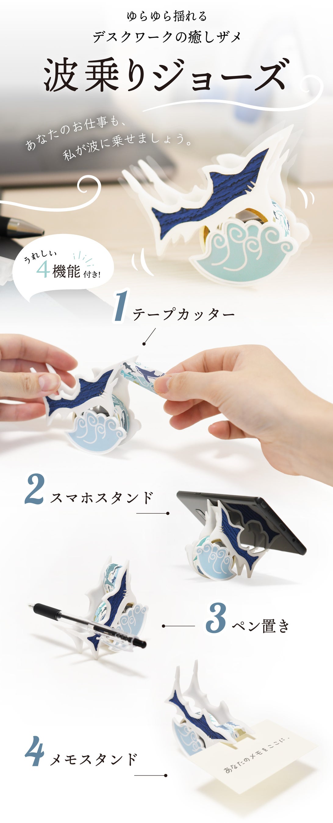 (プロジェクト名) 切る・伝言・置くはお任せ!仕事も勉強も良い波に乗せてくれるサメ革文具ジョーズくん