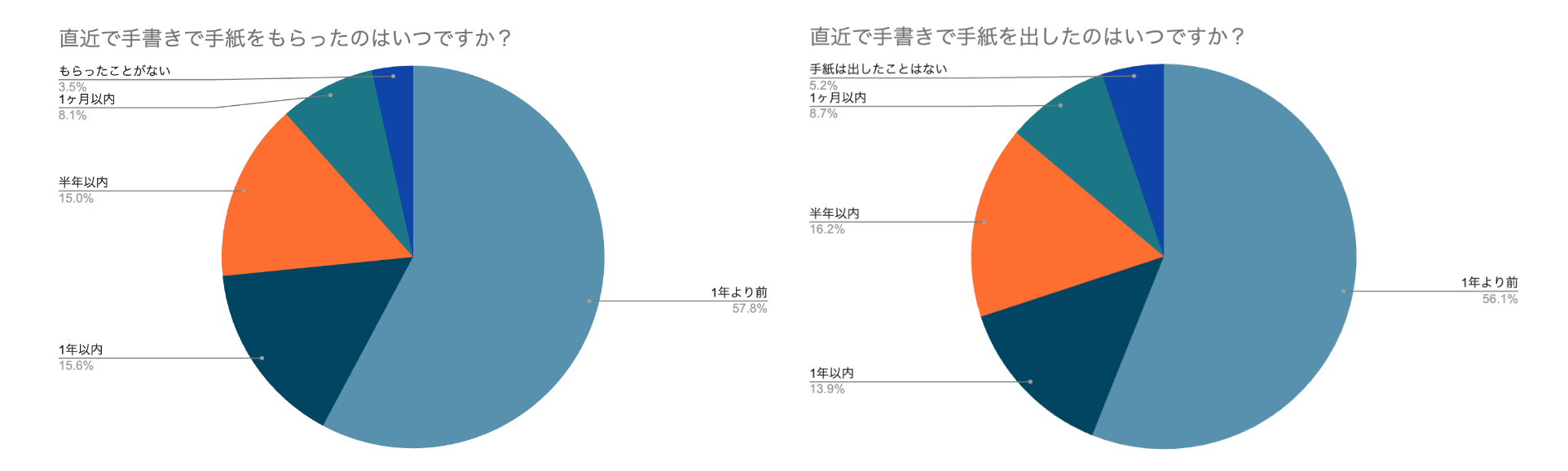 ■ 【直近で手書きの手紙をもらった、出したのはいつですか?】では6割以上が1年より前と答えました。