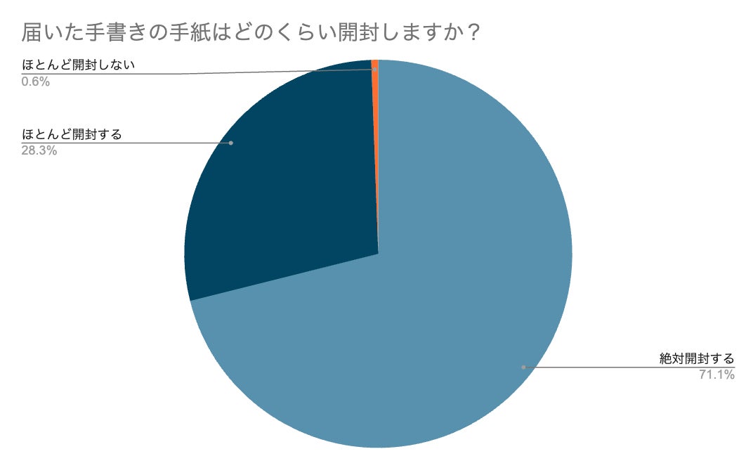 ■ 【届いた手書きの手紙はどのくらい開封しますか?】では、99%以上が開封すると答え、ほとんどすべての「手書きの手紙」は開封されるという結果となりました。このように、想いを伝える手段として「手書きの手紙」は大変効果的な手段であることがわかります。