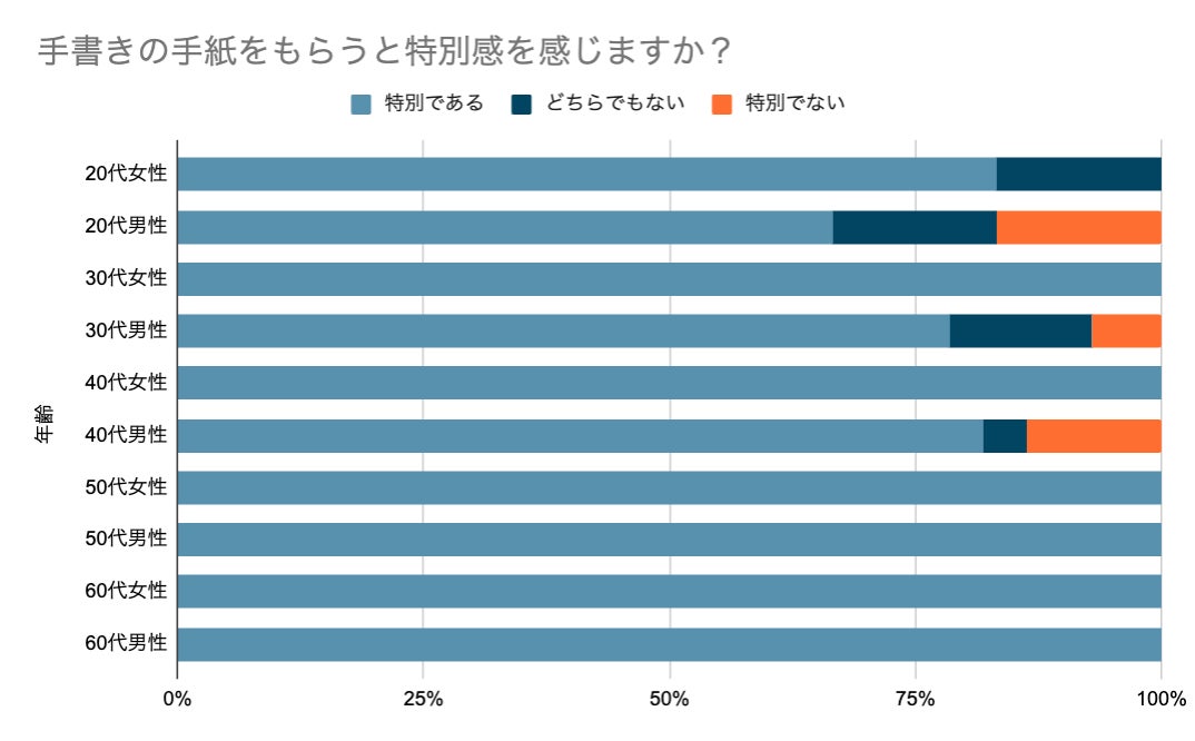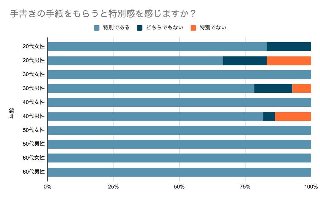 年齢、性別別に比較すると、若年層よりも50代・60代の方が手書きの手紙の特別感を感じていることがわかりました。