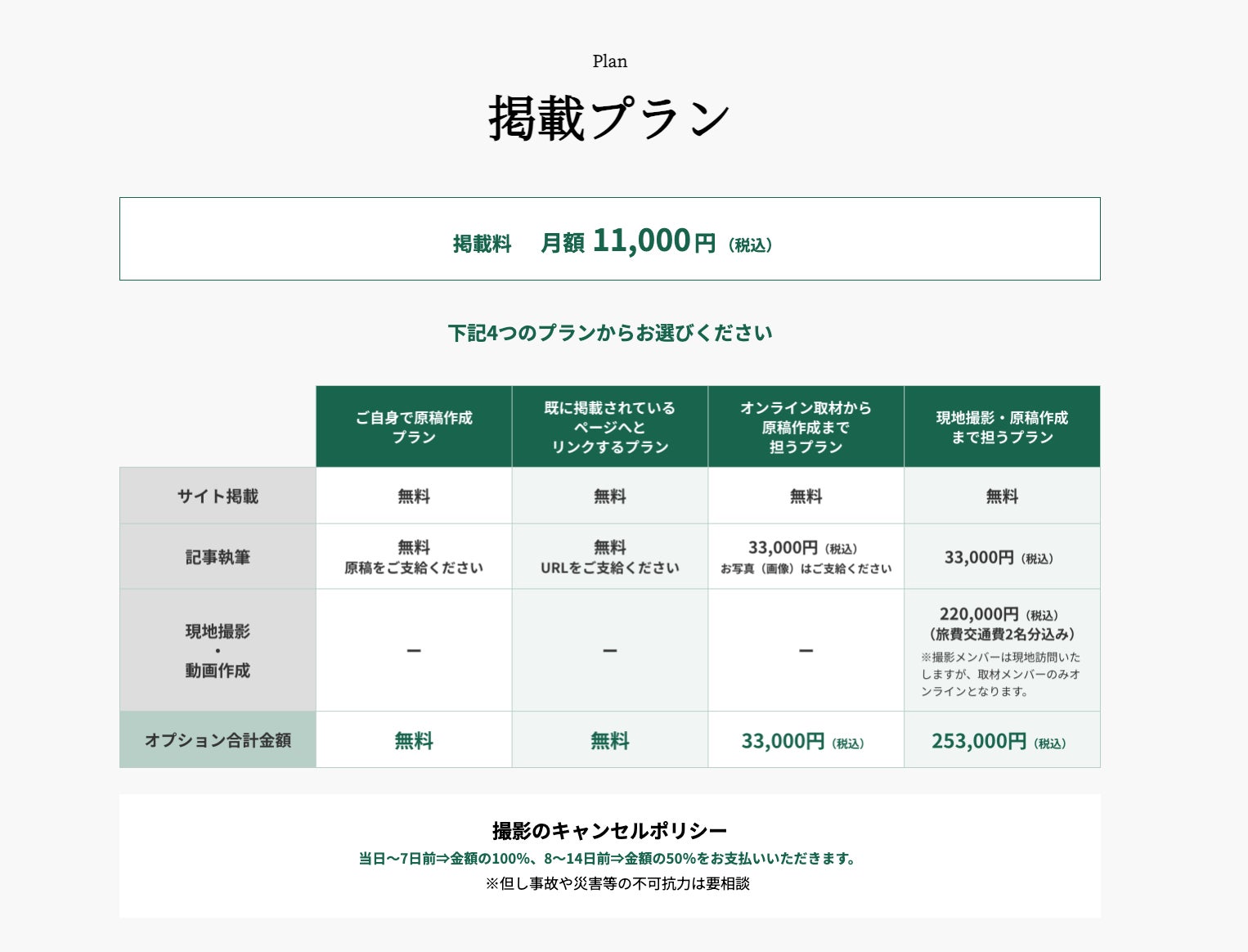 記事執筆や動画撮影・編集等を依頼する場合は別途費用が発生しますが、自身で原稿を作成するプランや記事作成・撮影・動画編集までトータルでKurumiが行うプランなど、価格の異なる4種類のプランから自由に選択することができます。