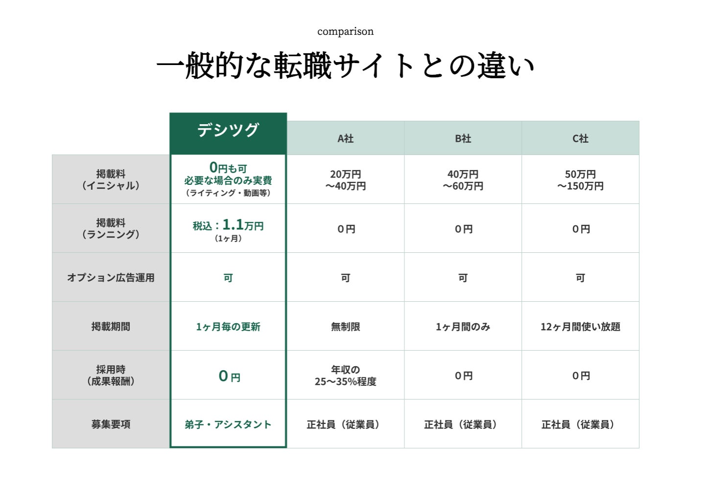 一般的な転職サイトの掲載料は約20〜150万円が相場ですが、デシツグは月額運用費1万円+税(年間にすると12万円+税)の低価格で募集記事を掲載可能。