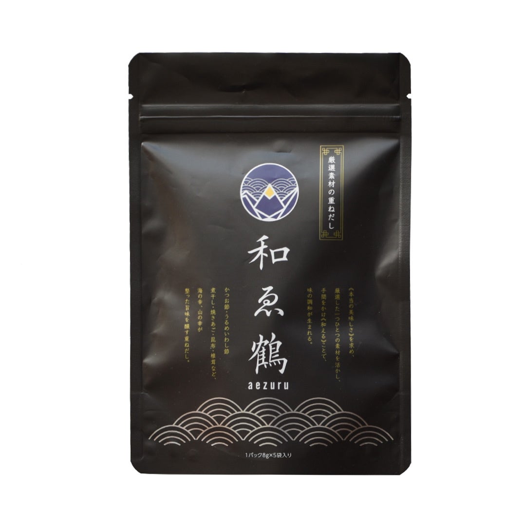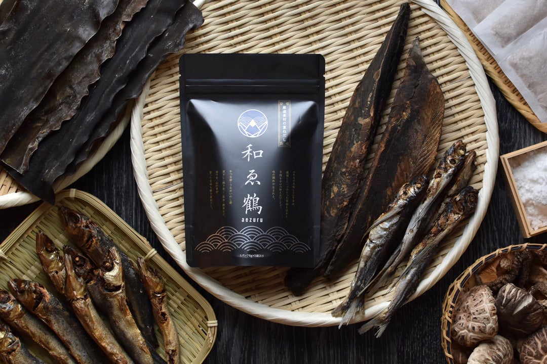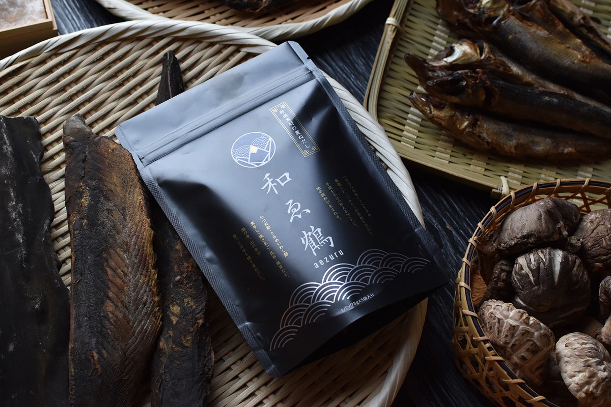 鹿児島県枕崎産の国内最高峰のかつお節を中心に、日本全国から集めた厳選素材の“調和”に徹底的にこだわり、丁寧な仕込みで風味豊かに仕上げただしパック、和ゑ鶴「あえづる」(https://www.aezuru.com/)。