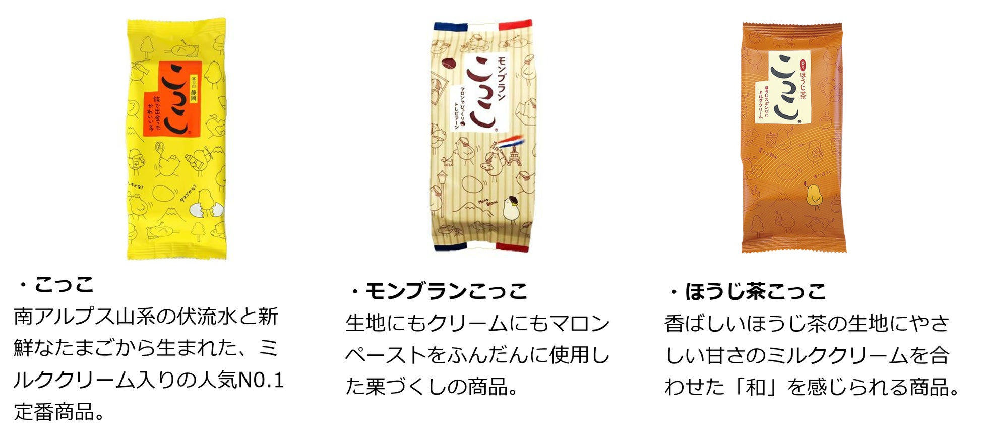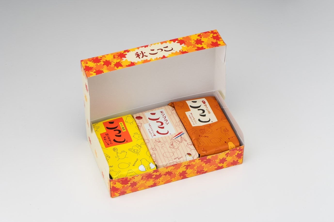 本商品は季節限定の「モンブランこっこ」に加え、今秋新登場の「ほうじ茶こっこ」、さらに人気No.1の「こっこ」が入った秋バージョンの豪華セット。静岡県民におなじみのキャラクターこっこちゃんが紅葉柄の中から登場するパッケージにもこだわっており、味にも見た目にも季節を存分に感じられる秋にぴったりの新商品です。
