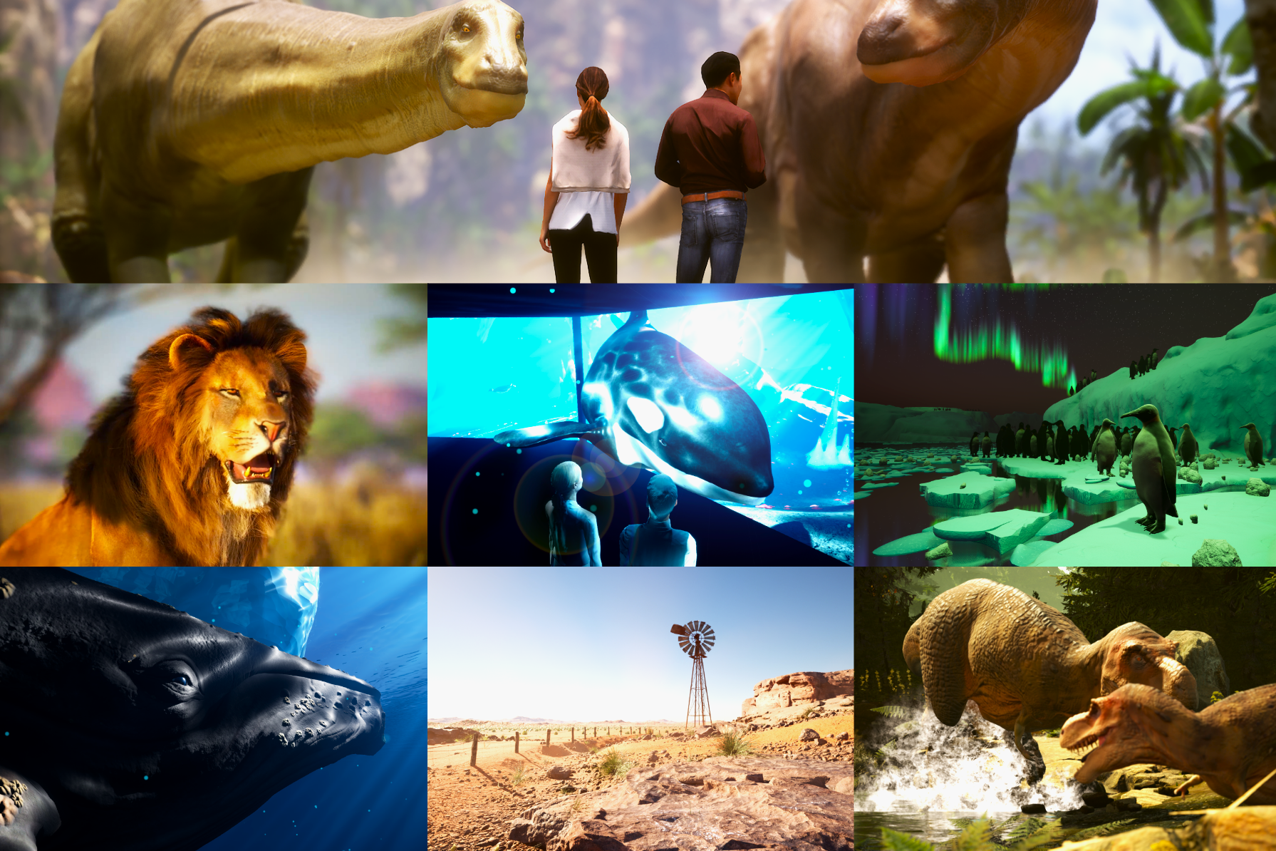 コンテンツは、恐竜、海中、アフリカサバンナなど5つのジャンルに各々5つのシーンを用意しておりリピート誘発にもつながります。また、本体は分解して移動できるので、イベント対応や巡回使用も可能です。