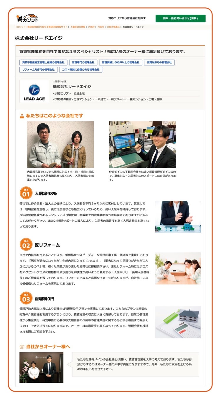 本サービスと提携している管理会社の特徴・強みを紹介したページを掲載しています。