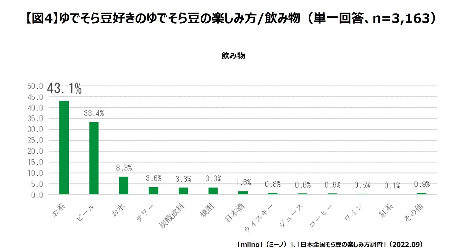 さらに、ゆでそら豆好きに楽しみ方(食べる場所、タイミング、調味料、飲み物)を尋ねたところ、「家」(83.3%)で「夕食時」(75.5%)に「塩」(80.7%)をかけて「お茶」(43.1%)をお供にしながら、というのがそれぞれ最も多い結果となりました。また、それぞれのテーマを見ていくと、飲み物については「ビール」(33.4%)がお茶に近い人気であることや、調味料については「何もつけない」が2番目に多い(10.9%)などの特徴が出ています。(【図4】参照)