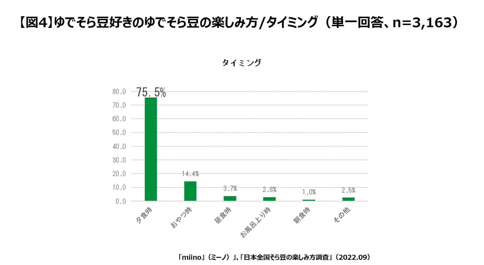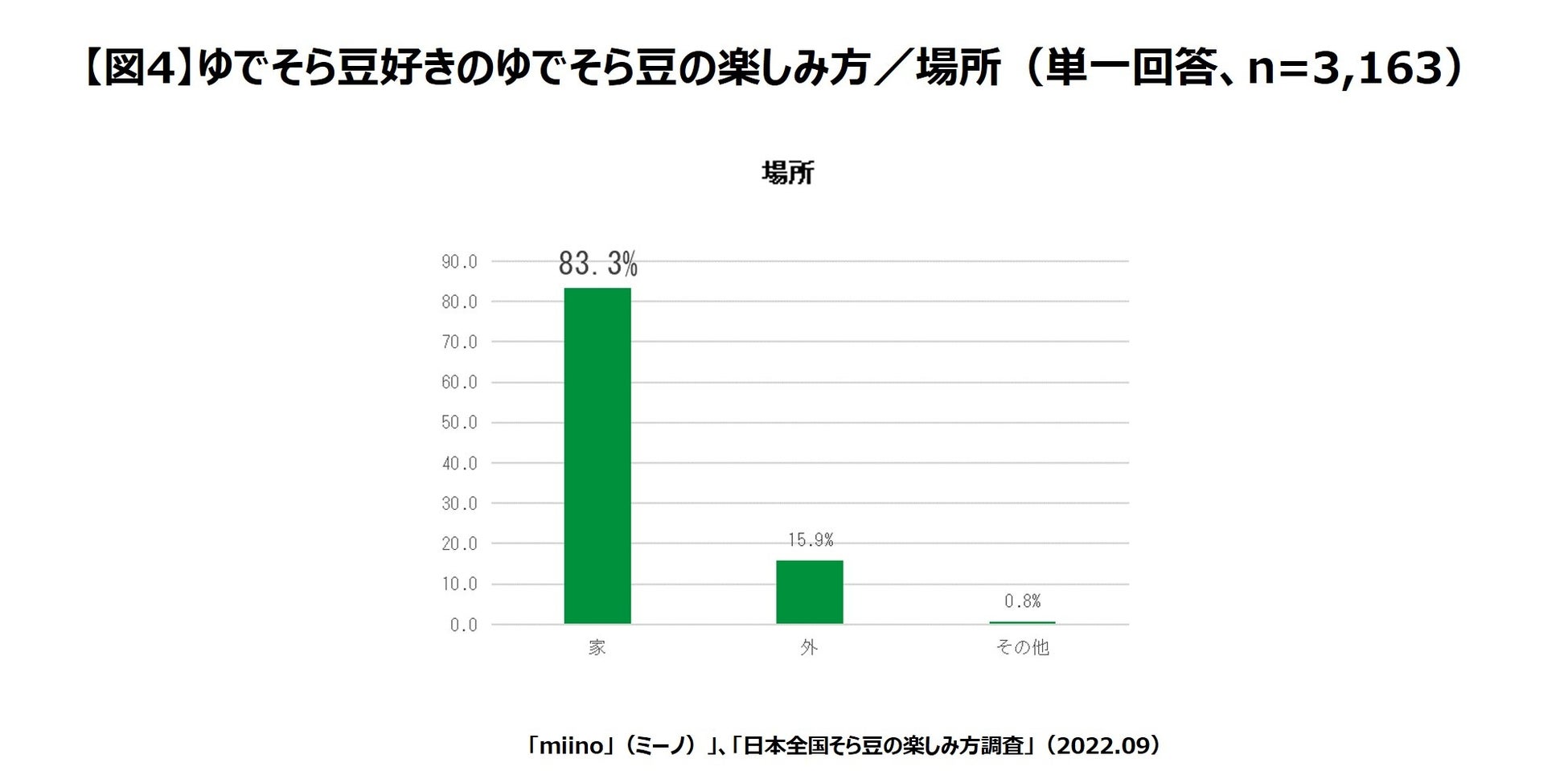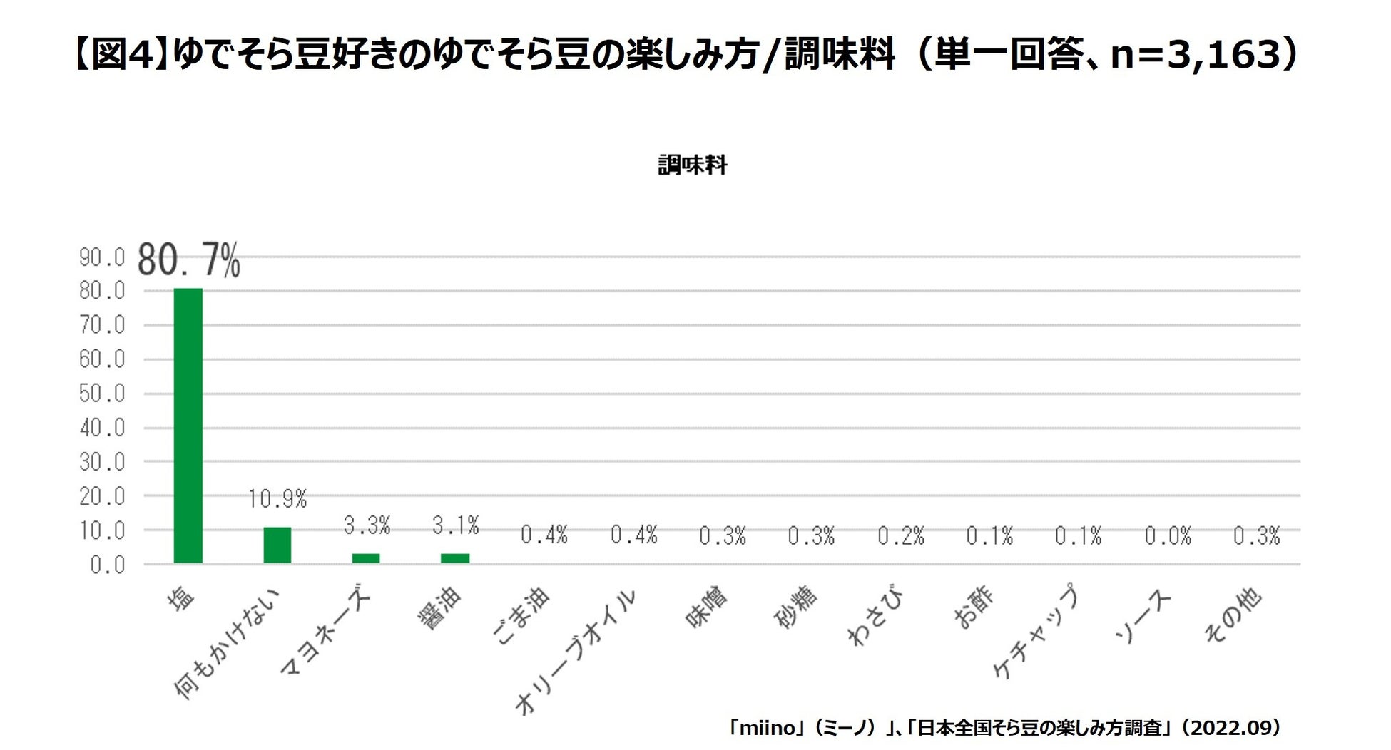 そんな、ゆでそら豆の楽しみ方は「夕食時」(75.5%)に「家」(83.3%)で「塩」(80.7%)をかけて