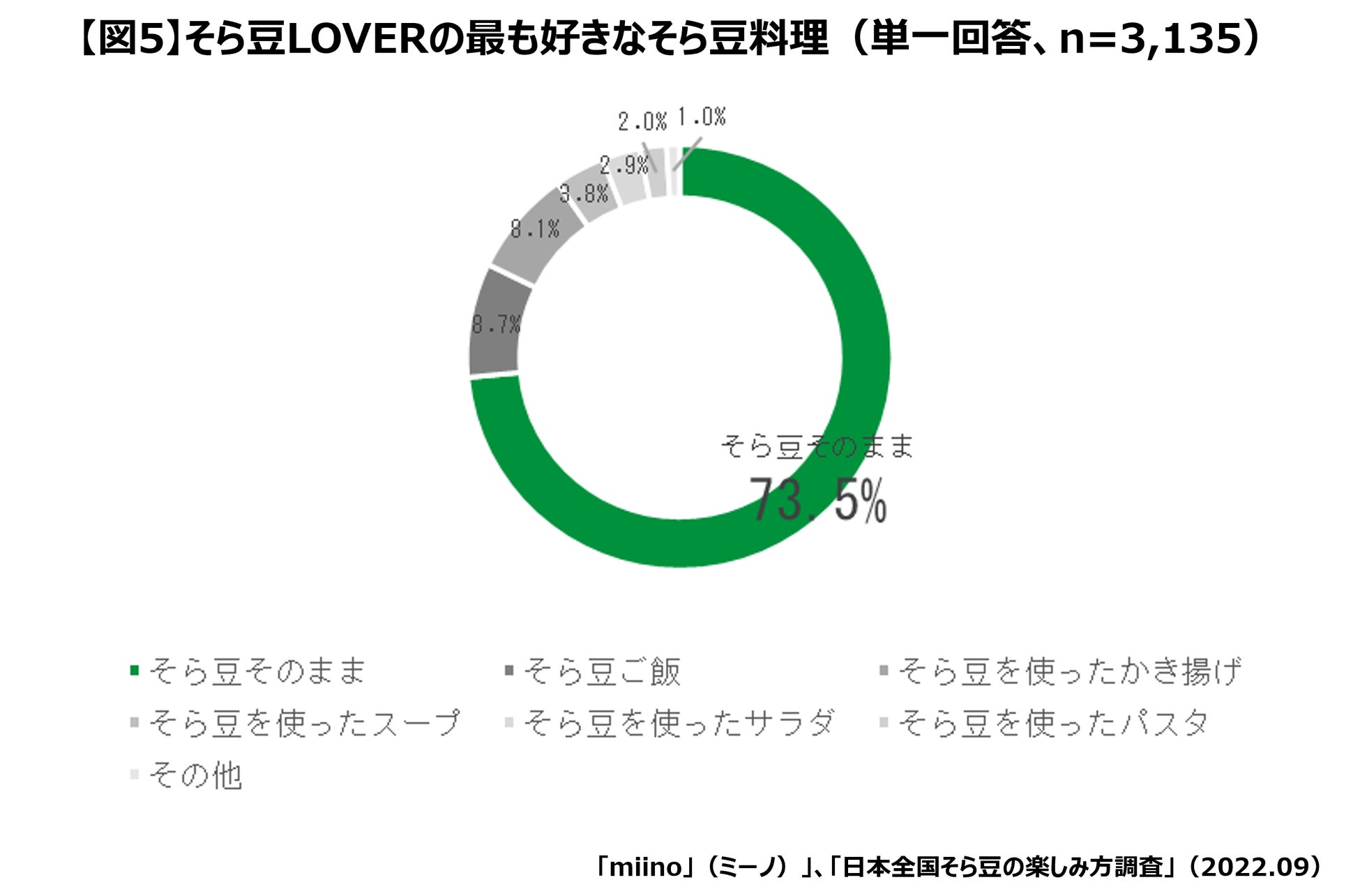 最後にそら豆LOVERに好きなそら豆料理を聞いたところ、「そら豆そのまま」が73.5%と圧倒的に多く、そら豆愛が伝わる結果になりました。(【図5】参照)