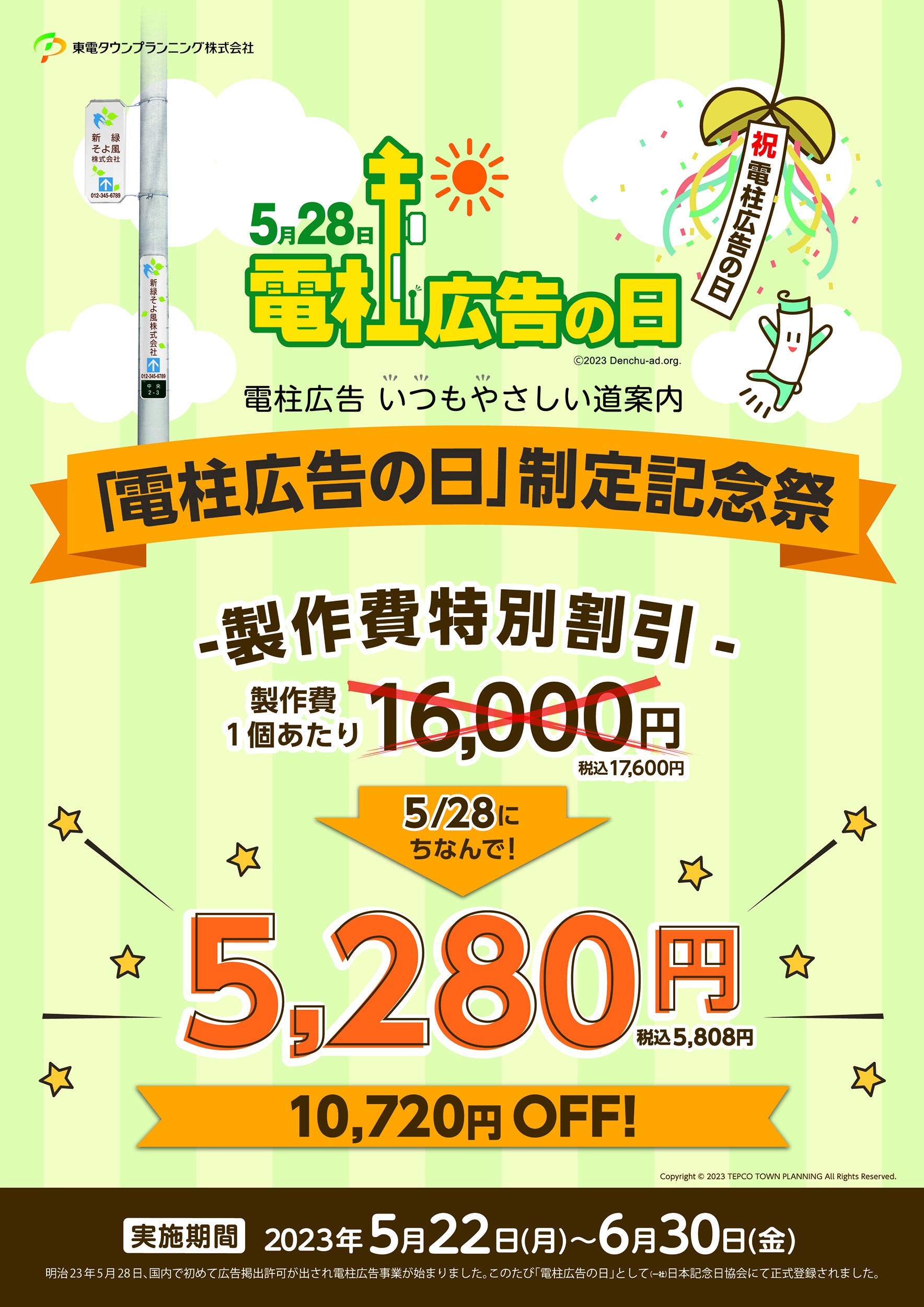 5月28日の「電柱広告の日」にあわせて、電柱広告の製作費が5,280円(税込5,808円)に大幅割引!