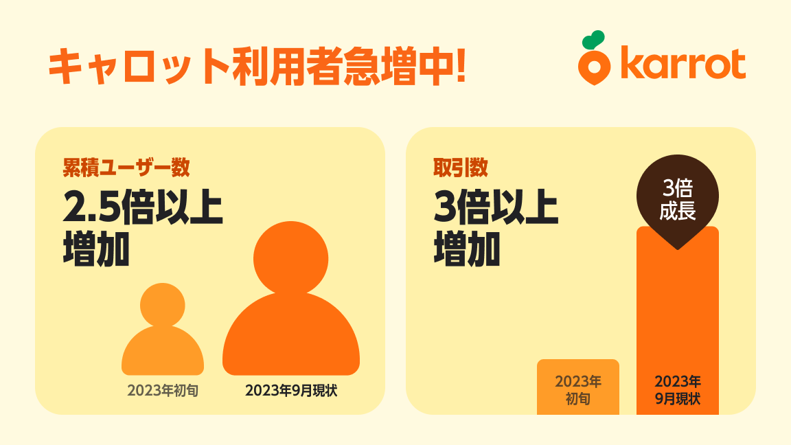 キャロットは、2023年初旬と比べ、2023年9月現状、累積ユーザー数, 月間利用者数は2.5倍に、出品数と取引数は3倍と大きく成長することができました!!
