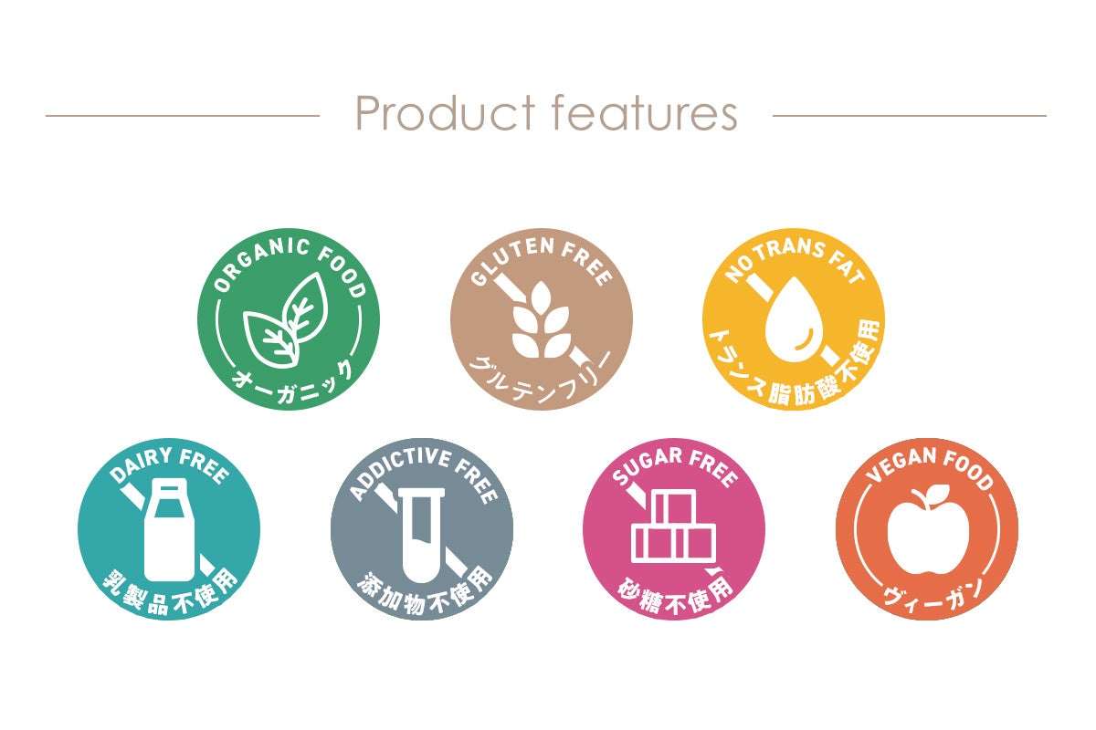 フレーバーによりヴィーガン、グルテンフリー、乳製品不使用、砂糖不使用等の商品を製造しております。アレルギーや体質など様々な理由で食事制限のある方にも安心してお召し上げりいただけるよう選択肢を広げました。