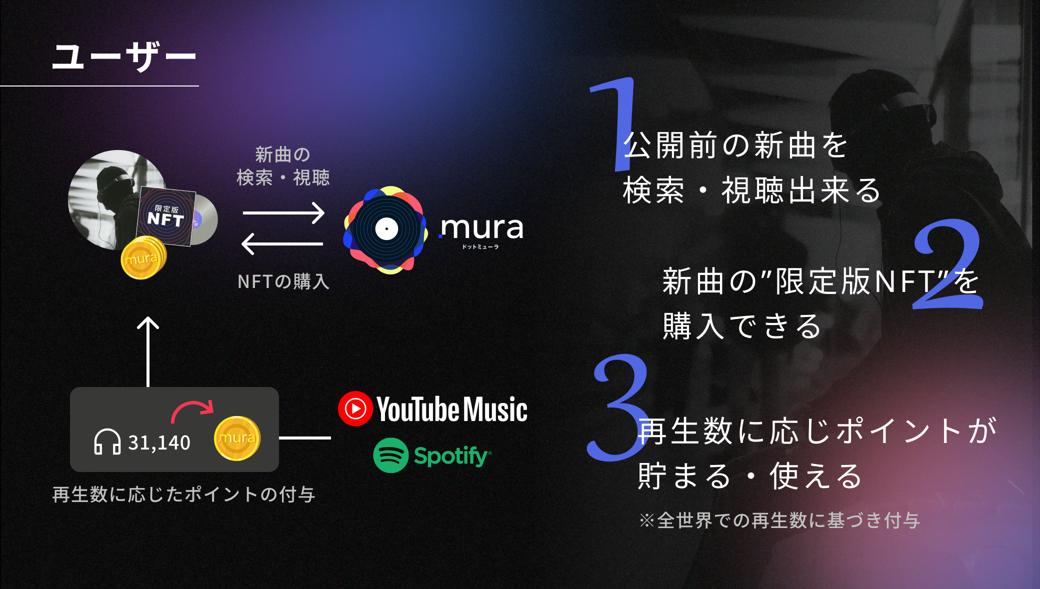 NFTの購入後、楽曲がストリーミングサービス等で配信開始されると、NFTの保有者には全世界での再生数に応じてポイントが付与されます(つまり、楽曲が人気になればなるほど、ポイントが貯まります)。ポイントはドットミューラから提供される様々な特典に利用することが出来るほか、ブロックチェーン上に発行された”ミューラコイン”に変換することも出来ます。