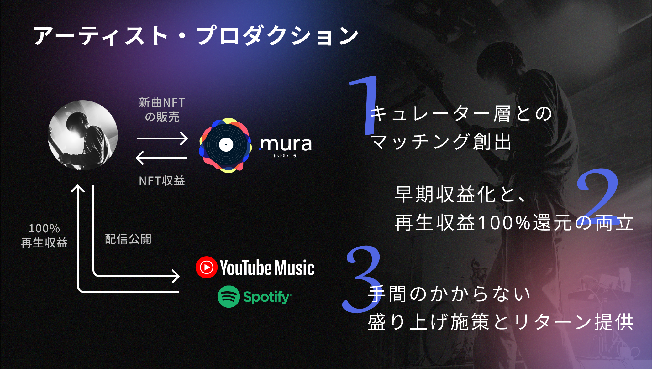 ドットミューラ株式会社(本社:東京都渋谷区、代表取締役:伴幸祐)は、音楽NFTマーケットプレース「.mura(ドットミューラ)」のリニューアルを発表します。新曲をリリースする際に、その曲の限定版NFTを販売し、音楽ファンは未公開の曲の中から自分が気に入った曲の限定版NFTを購入し保有することができるサービスに生まれ変わります。