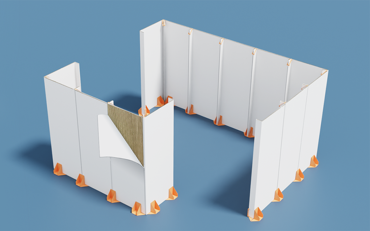 イベントにおける迅速かつ安全が求められる仮設空間構成力を活かし、被災地避難所に必要となるプライバシーの確保の課題に対して、誰でも簡単に、そして安全に組み立てることができる防炎段ボール製の間仕切り壁を株式会社トーモクと共同開発しました。新型コロナウイルスの対応では、ワクチンの大規模接種会場の間仕切り壁として活用いただきました。