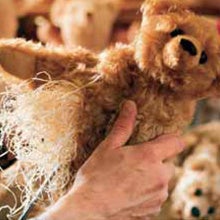 シュタイフ社の製品は、モヘア、アルパカなどの高品質な自然素材や、安全性・耐久性に優れた新素材を使用します。選ばれた素材は毛並みに忠実に、パターンに合わせて裁断され、職人たちの手によって縫製されます。縫い上げられたぬいぐるみには、綿や木毛、ポリエステルといった、製品に適した中身が詰められ、丁寧に形づくられていきます。
