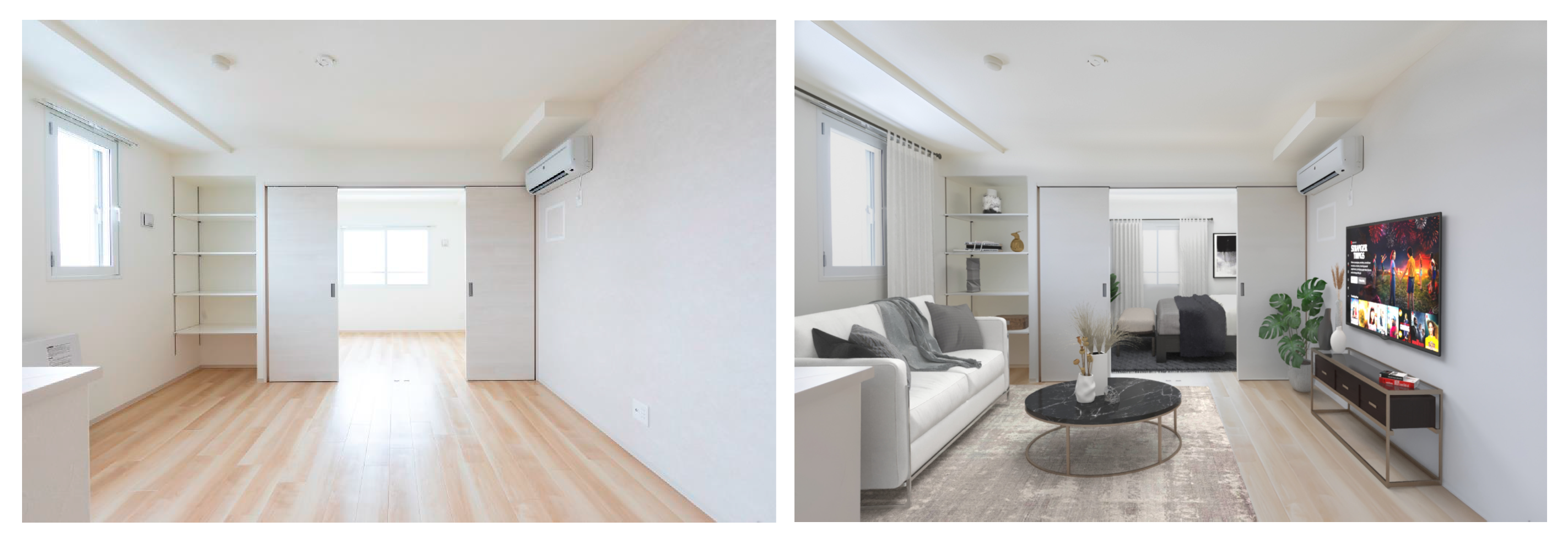 当社は、不動産売買・賃貸の市場において、より多くの買い手や入居者を獲得するために居室内に家具家電・インテリアを購入し、それらを設置した室内写真を媒体に掲載する「ステージング」業務の在り方に課題を感じ、当サービスを開発いたしました。