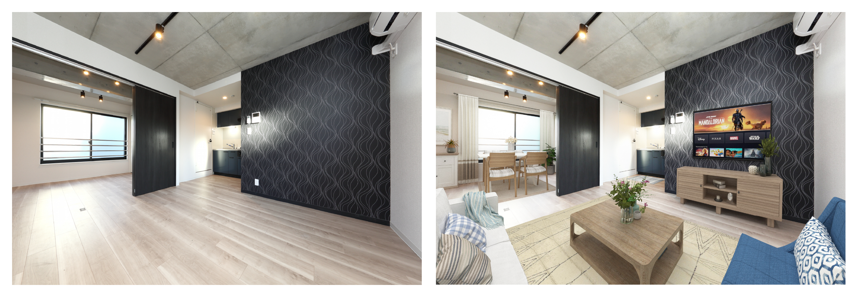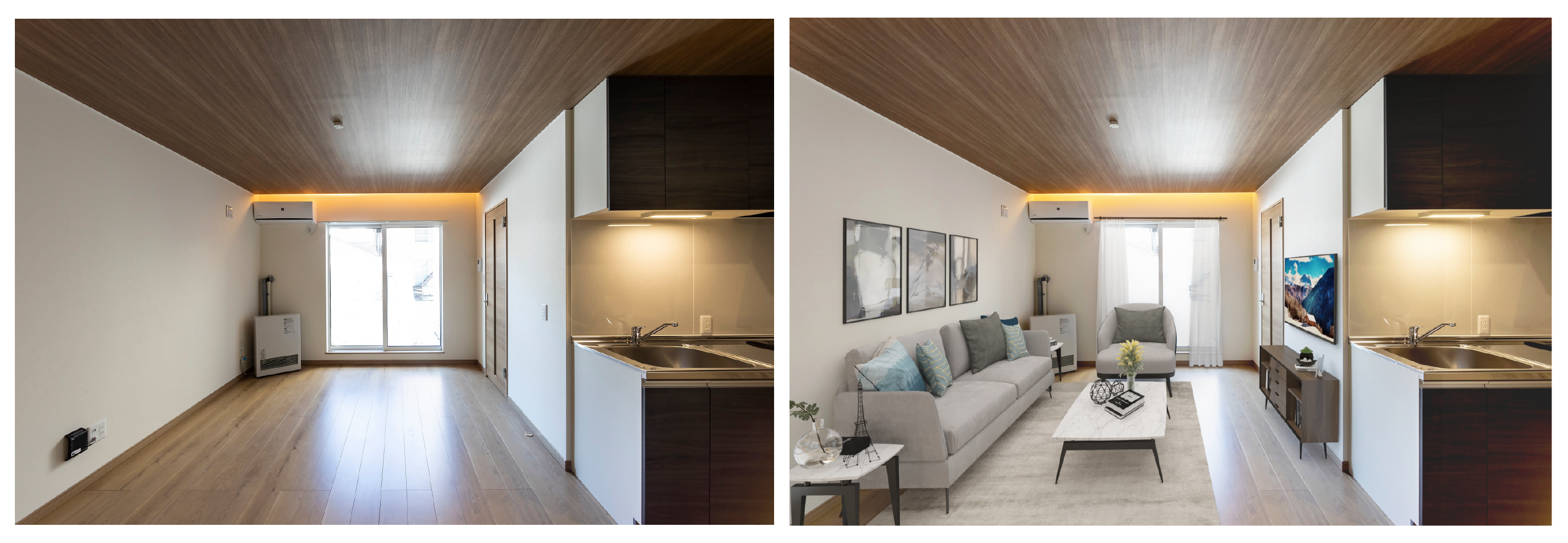 現在主流とされるステージングの手法には、①室内にインテリアを購入・設置する方法、②専門のデザイナーが空室写真にCGのインテリアを配置・加工する方法があります。