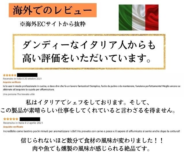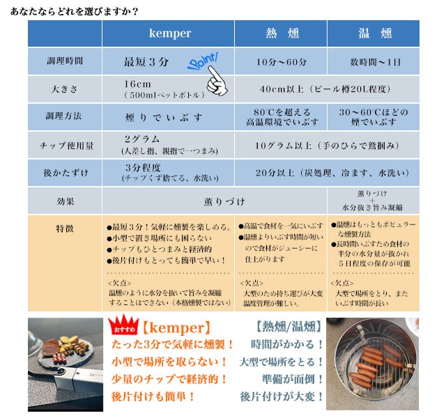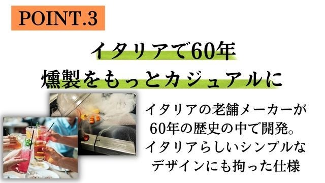 イタリア、パルマに本社を置く60年続く老舗企業Kemper製の製品であり、そこにはヨーロッパで流行っている理由がある。燻製をもっとカジュアルに!今秋日本で流行間違いなしの新製品だ。