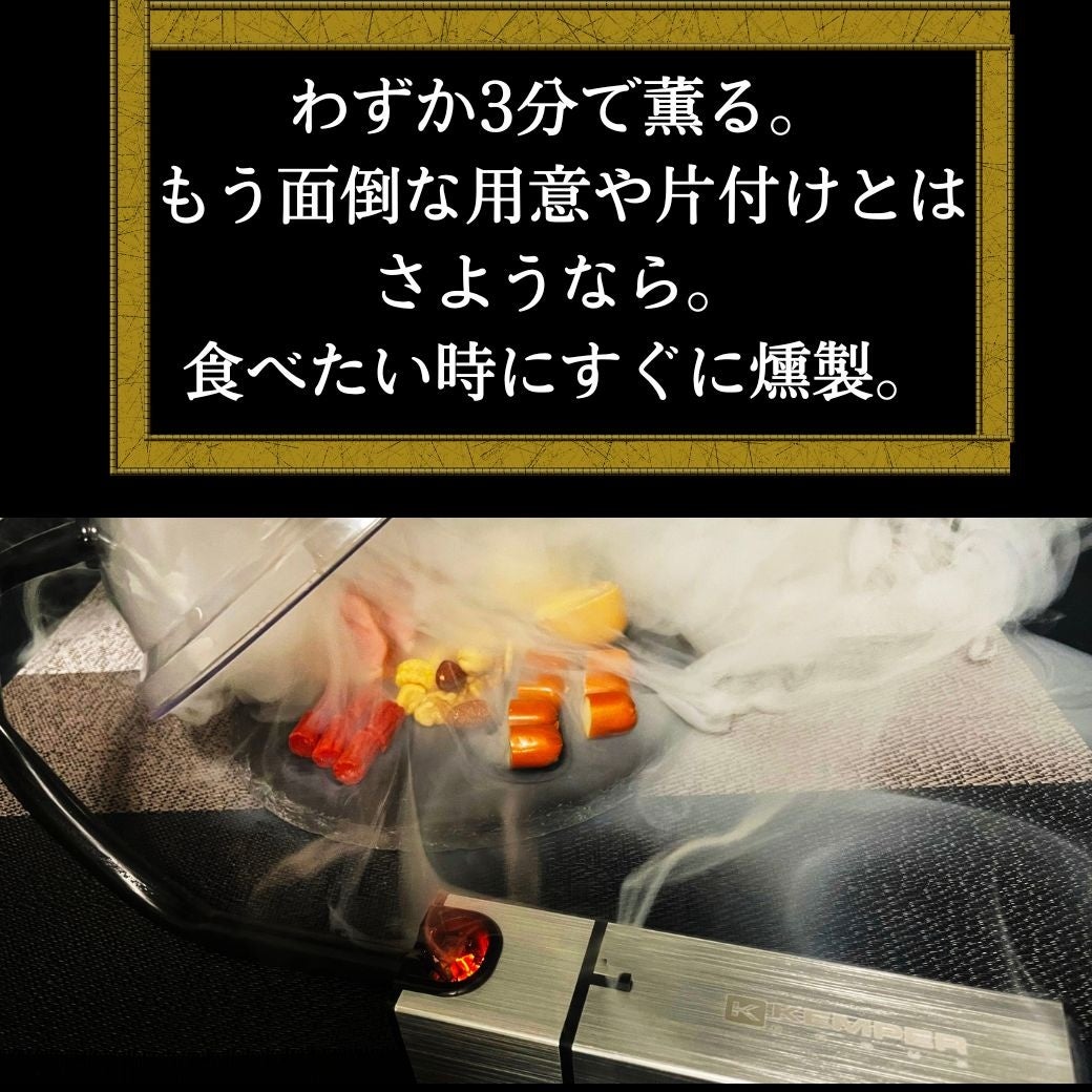 燻製と言えば片付けが面倒であり、調理まで時間がかかるイメージ。しかし本製品はわずか3分で薫り、すぐに食べられる燻製料理。