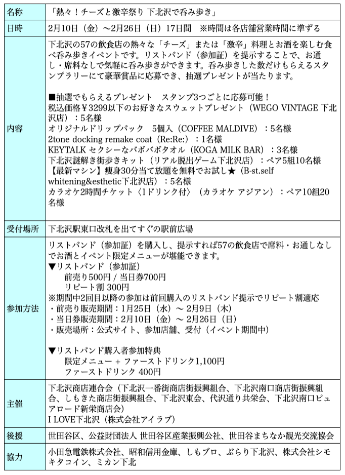 | 名称 | 「熱々!チーズと激辛祭り 下北沢で呑み歩き」 |