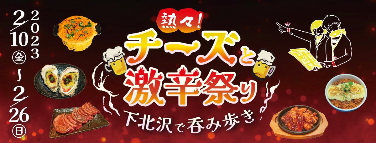 株式会社アイラブ(東京都世田谷区、代表取締役社長 西山友則)と下北沢商店連合会は、2023年2月10日(金)から2月26日(日)の17日間、「チーズ」と「激辛」をテーマにした熱々料理と、行きつけのお店を見つけられる呑み歩きイベント「熱々!チーズと激辛祭り 下北沢で呑み歩き」を開催いたします。過去15万人以上が参加し、スタンプラリーで応募できる抽選プレゼントや呑み友スタンプラリーも大好評のイベントです。今回は57店舗の飲食店が、特に人気の高い「チーズ」と「激辛」をテーマに真冬の寒さを吹き飛ばすイベント限定の熱々メニューをご用意します。この機会にぜひ、カラダの芯からアツくなる下北沢をご堪能ください。