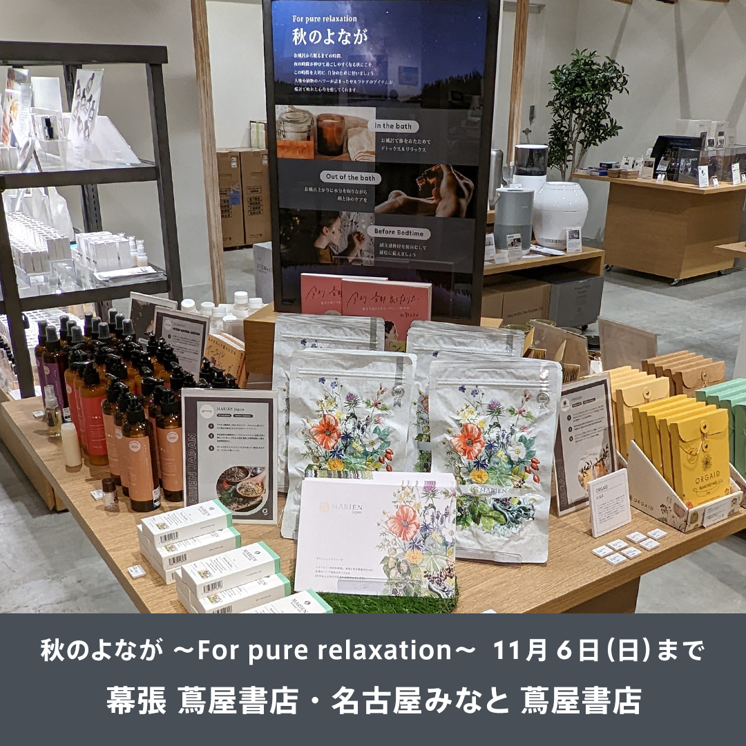 goooods株式会社(本社: 東京都港区 代表取締役CEO: 菅野圭介)は、"秋のよなが〜For pure relaxation〜" をテーマとしたフェアを幕張 蔦屋書店および名古屋みなと 蔦屋書店にて開催しております。