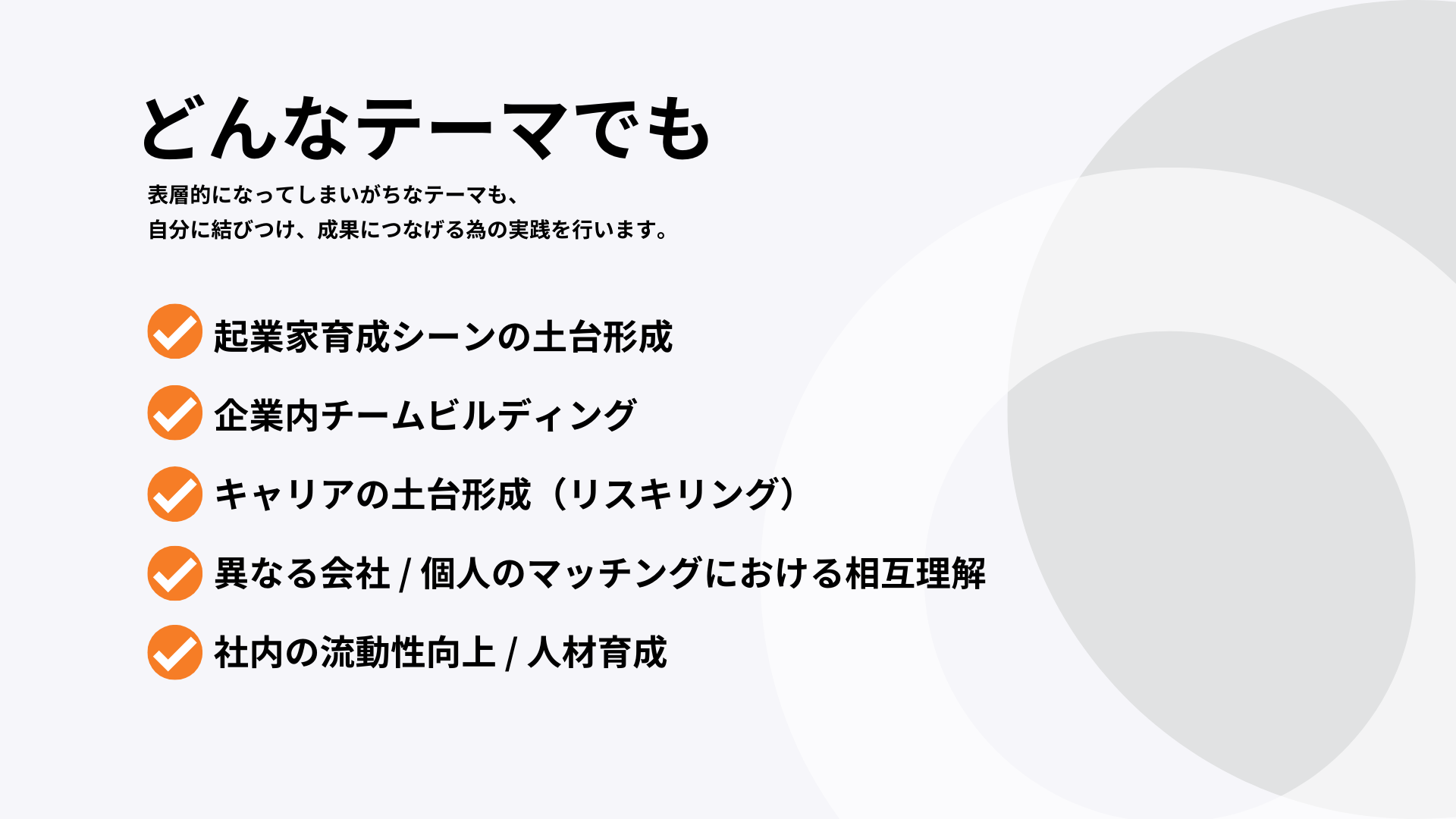 私たちOoOは、「自立した個として活躍できる人を増やす」というビジョンを掲げ、変化の激しい時代においても安心して活躍できる人を増やす活動をしています。