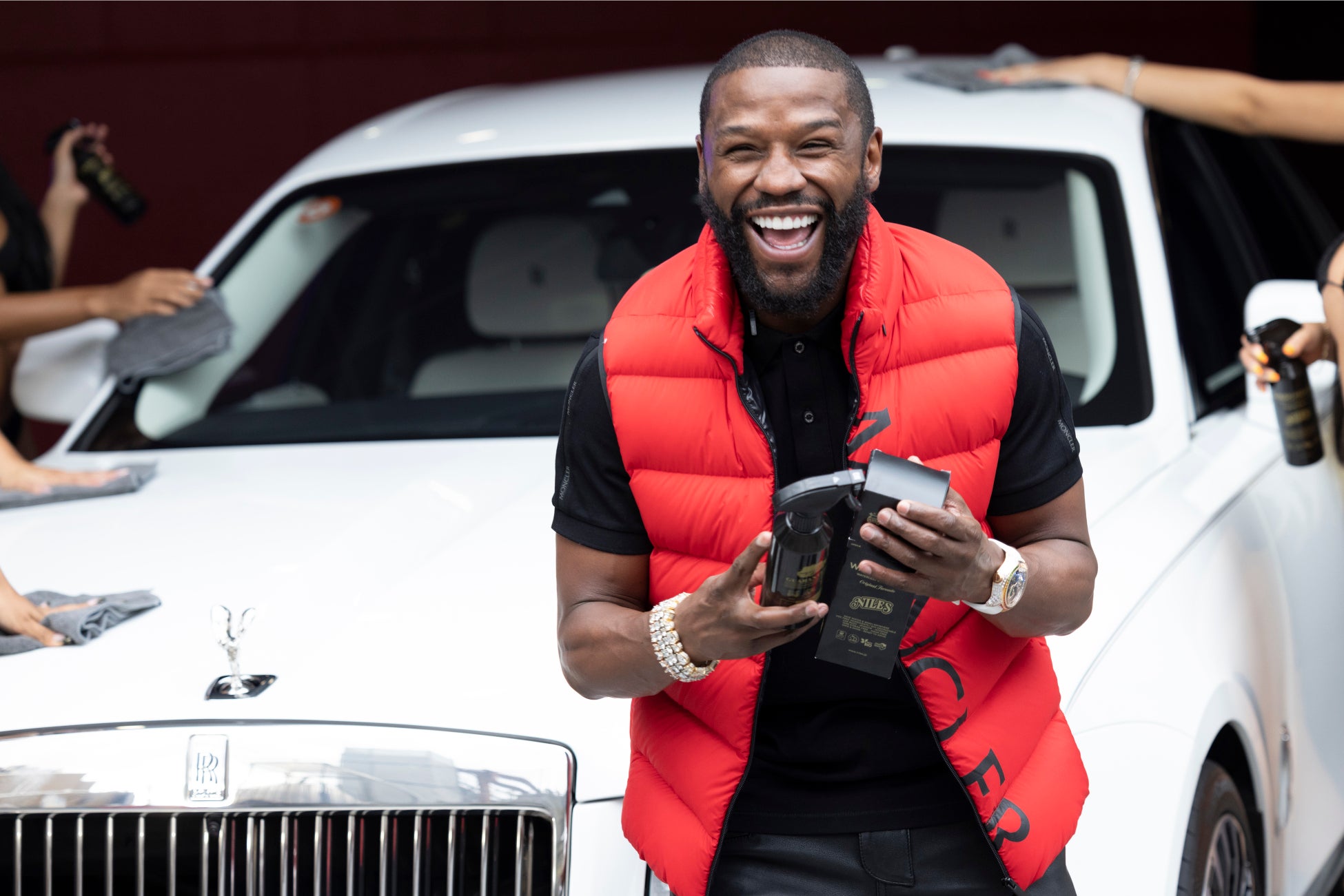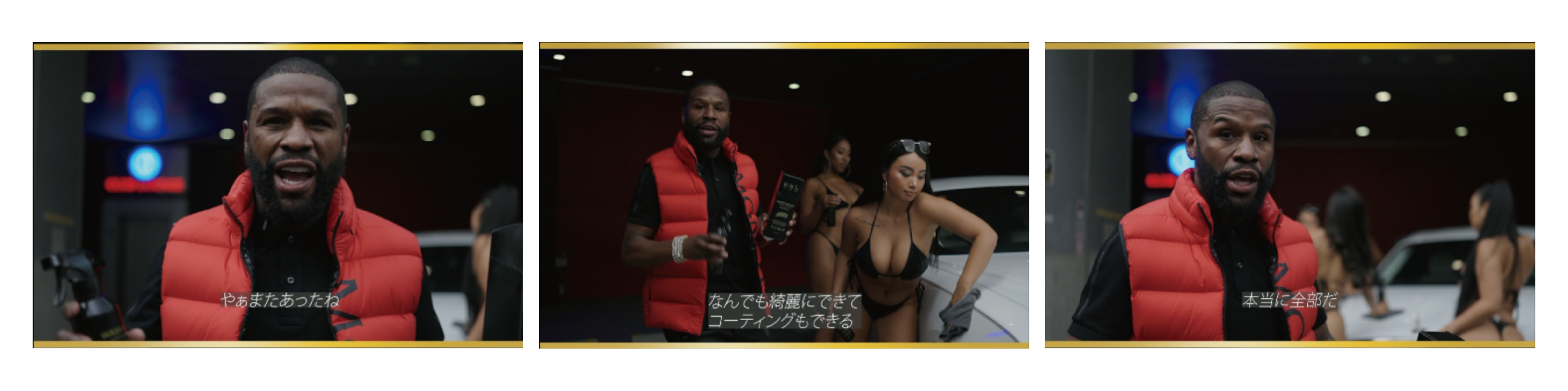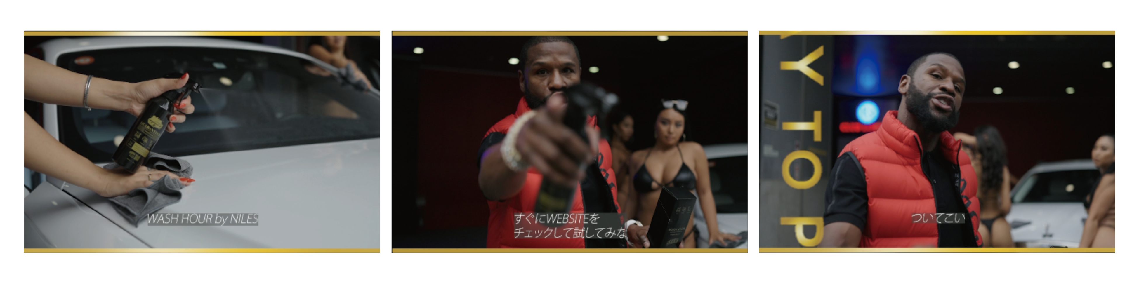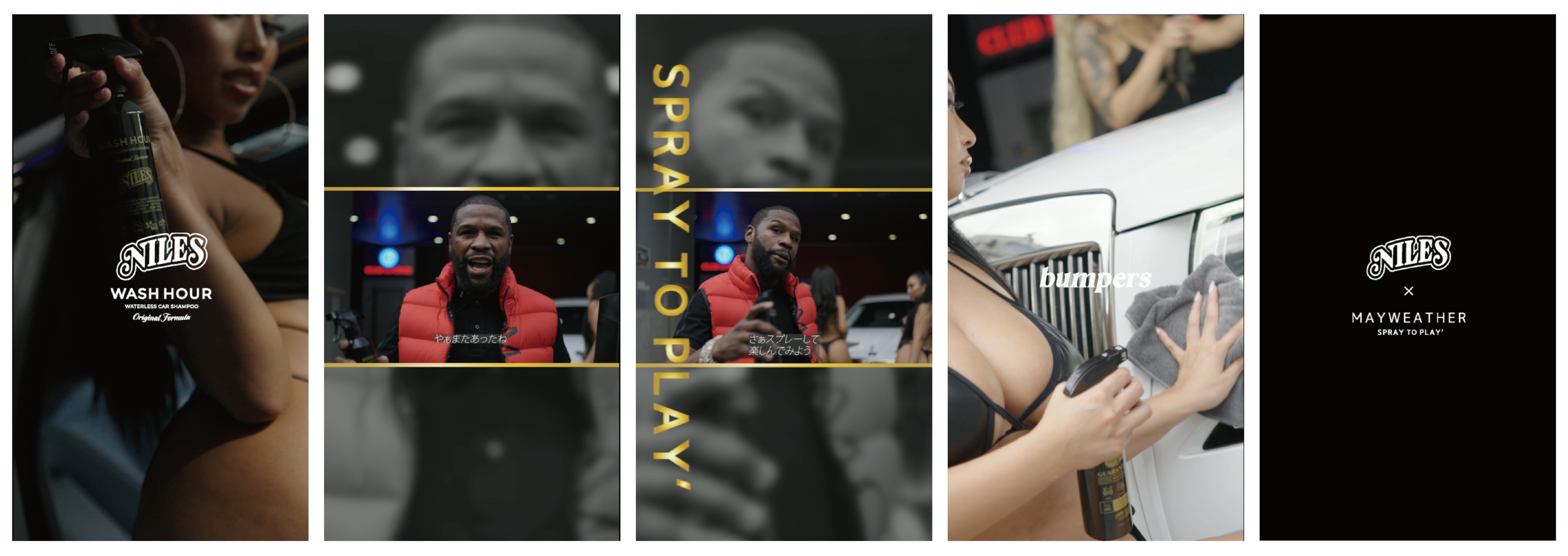メイウェザーが洗車業界初の本格的水無カーシャンプー&コートNILES WASH HOUR のPR動画に出演、日本企業では初となる本格的な広告動画となった。本編の中でも語られているようにデザイン性、どこにでも使える用途の多さ、性能等は決して台本ではなく、本人も使い心地を実感しており、今回の撮影ではメイウェザー本人の言葉をそのまま使用した。チャンピオンという“強い”イメージがある反面で、共演モデルにも優しく写り方のアドバイスをするなど、紳士で優しい本当の姿が見られた。本物のチャンピオンが紹介してくれたこのWASH HOURはまさに洗車界のチャンピオンになる存在として、コンセプトは高級、ハイセンス、そして本当の高級とは値段ではなく、品質そのものだと証明していく。■NILES WASH HOUR コンセプト