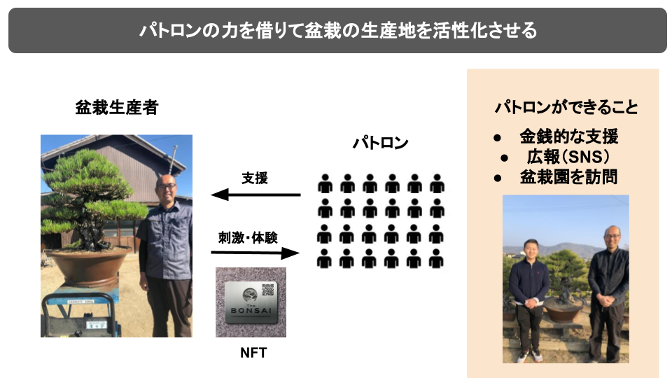 松盆栽生産の国内シェア80%以上を占める高松盆栽ですが、市場の縮小や後継者難など喫緊の課題が山積しています。そんな中、1年以上前からNFTに着目し、所有(オーナー権をNFT化)と管理を分離した新しい盆栽の所有体験を実現し、棚にある盆栽からも収益を得るビジネスモデルを模索しています。第一弾プロジェクトとなるパトロンNFTは、このゴールに向けた第一歩の位置づけで、盆栽の関係人口を増やすこととプロジェクトの仲間集めを目的とします。