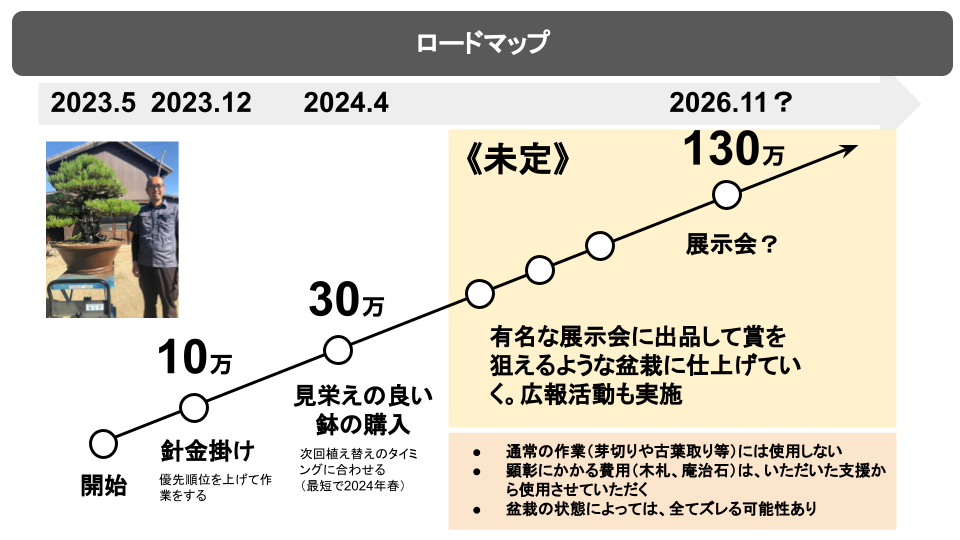 パトロンNFTのゴールは、国内で影響力のある展示会(国風展や大観展など)へ出品して賞を獲ることです。もちろん、樹の状態によっては展示会に出せないこともありますので、段階を踏んで支援を集めていきます。まずは2023年12月までに50万円を集め、展示会を意識した針金掛けと見栄えの良い鉢の購入などの資金とする計画です。初日で約40万円ご支援いただいているため、針金掛けと鉢の購入までは実行できます。それ以降は樹の状態を見極めつつ、既存のパトロンに継続支援を求めながら、新たなパトロンにも集まっていただけるようPRしていきます。