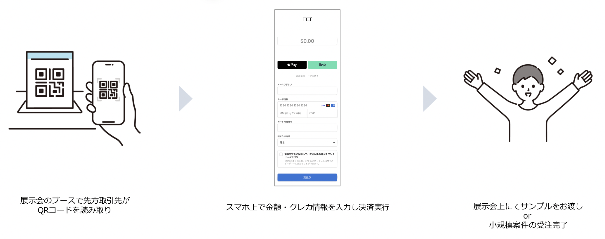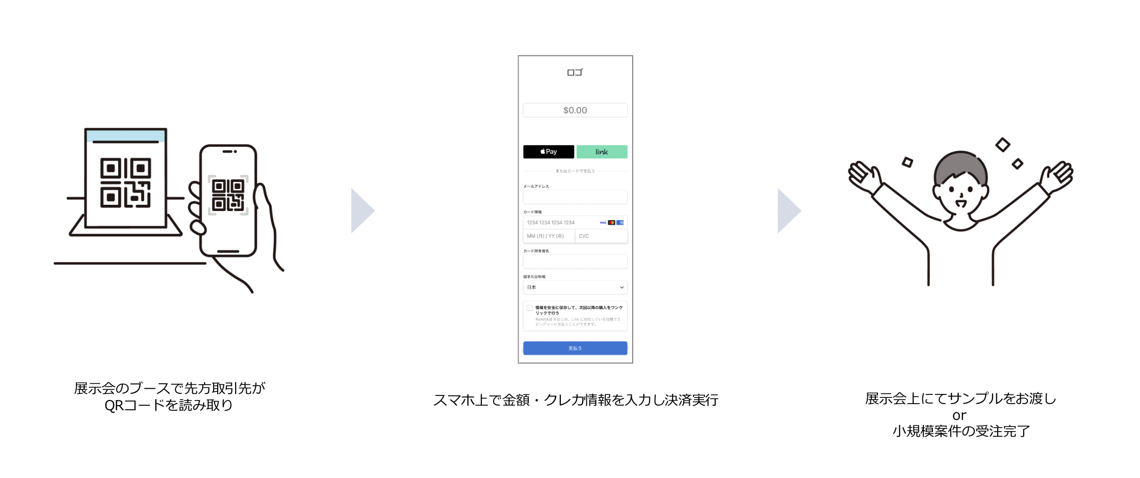 展示会場にてクレジットカード決済が可能となるリンク(QRコード)をご提供し、その場で小ロットの取引やサンプルの受注が受けられるようにご支援いたします。