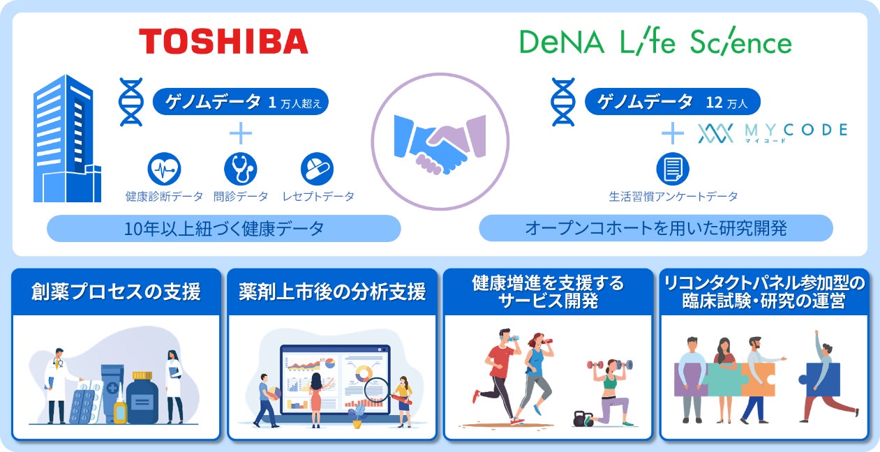 株式会社東芝(本社:東京都港区、代表執行役社長CEO:島田 太郎、以下 東芝)と株式会社ディー・エヌ・エー(本社:東京都渋谷区、代表取締役社長兼CEO:岡村 信悟)の子会社である株式会社DeNAライフサイエンス(本社:東京都渋谷区、代表取締役社長:砂田 真吾、以下 DeNAライフサイエンス)は、両社がそれぞれ蓄積してきたゲノムデータを含むヘルスデータの利活用の協業に向けた検討を開始しました。