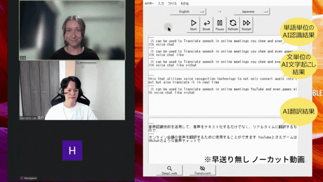 このPCソフトウェア「音翻訳NOW」により、外国語web会議でAIによる翻訳結果を見られるのはもちろんのこと、文字起こし結果と翻訳結果の両方の全文のテキストが得られるので、会議でのネイティブの発言を後から振り返り可能となり、口語表現の勉強になったり、議事録作成の効率も上がることが期待されます。
