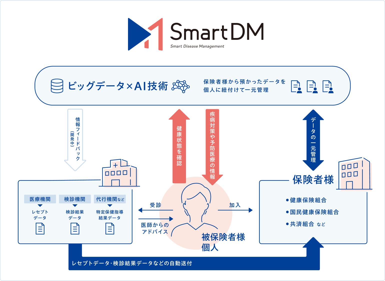 SmartDMは、「レセプトデータ」と「健診データ」とを一元管理したデータベースにAIを適用した、データヘルスの未来を拓くサービスです。弊社が長年培ってきたレセプト審査業務のノウハウを高度に形式知化したAI技術によって、一人ひとりの被保険者様に応じた疾病対策や予防医療対策をSmartDMから提案します。SmartDMにより、被保険者様に的確な医療の提供が可能となれば、医療費の削減が十分に期待でき、保険者様の経営強化が実現されます。