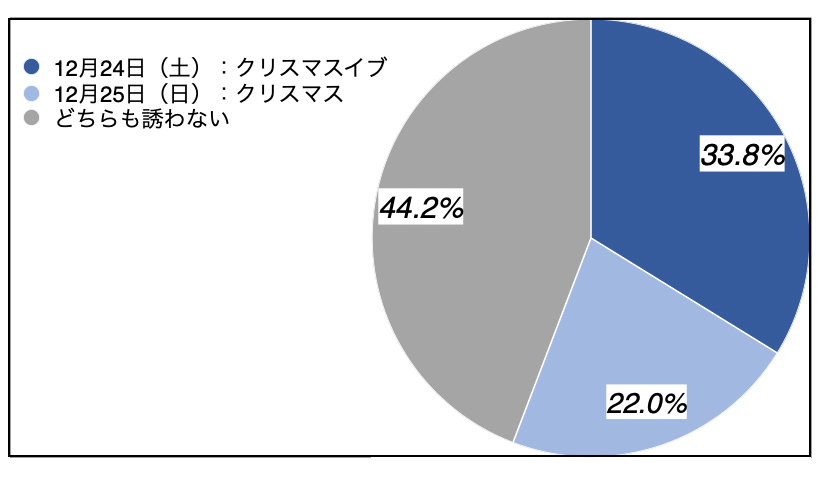 次いで「クリスマスイブ(24日)」が33.8%、「クリスマス(25日)」が22%となっています。
