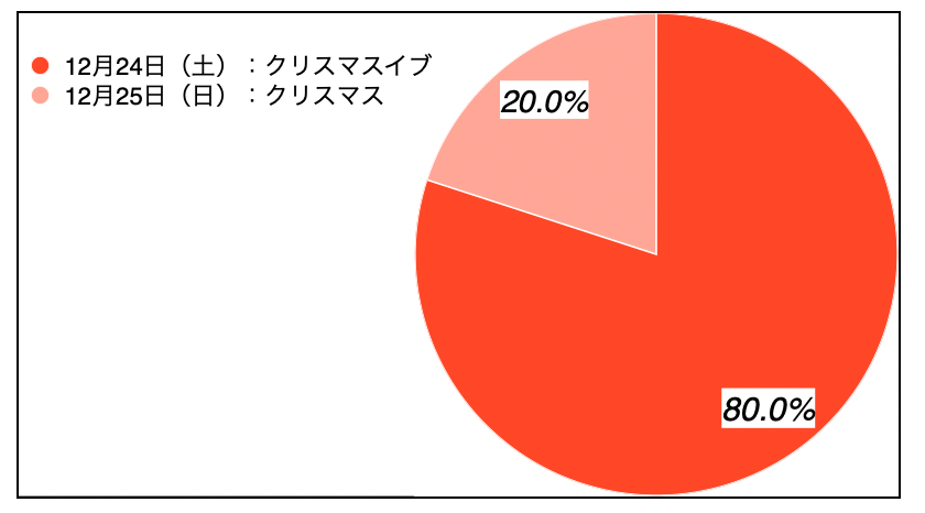 土日にクリスマスが重なった結果、難しい判断が迫られてしまいますが、この結果から本命のお相手はクリスマスイブ(24日)にデートに誘うことをおすすめします。
