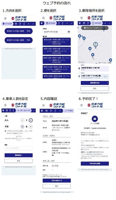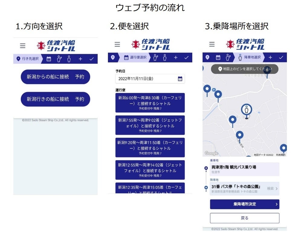 利用希望者は専用ウェブサイトから乗船予定の船の日付と便を選び、利用したい乗降場所を選択することで簡単に予約することができます。佐渡汽船の予約センターへの電話で予約いただくことも可能です(ただし一部の時間帯の便を除く)