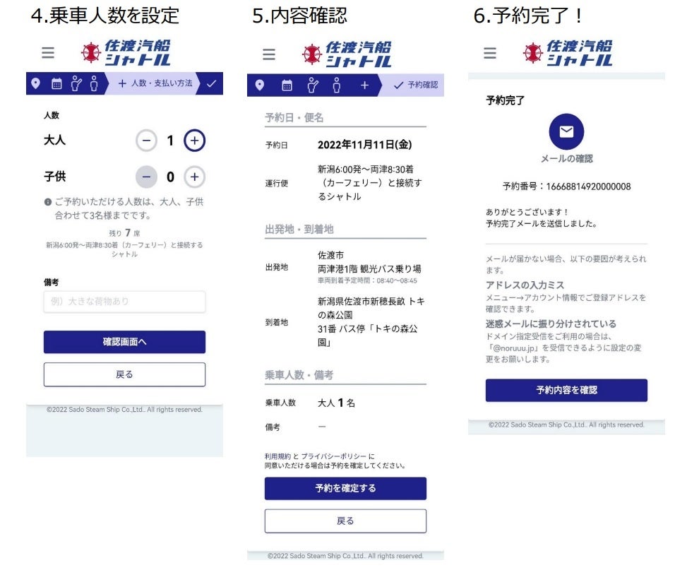 ・ 予約方法:ウェブ予約または佐渡汽船予約センターでの電話予約
