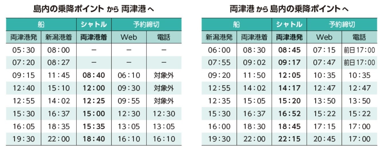 ・ 対応する船便:全便(ただし 5:30 両津発、7:20 両津発を除く)