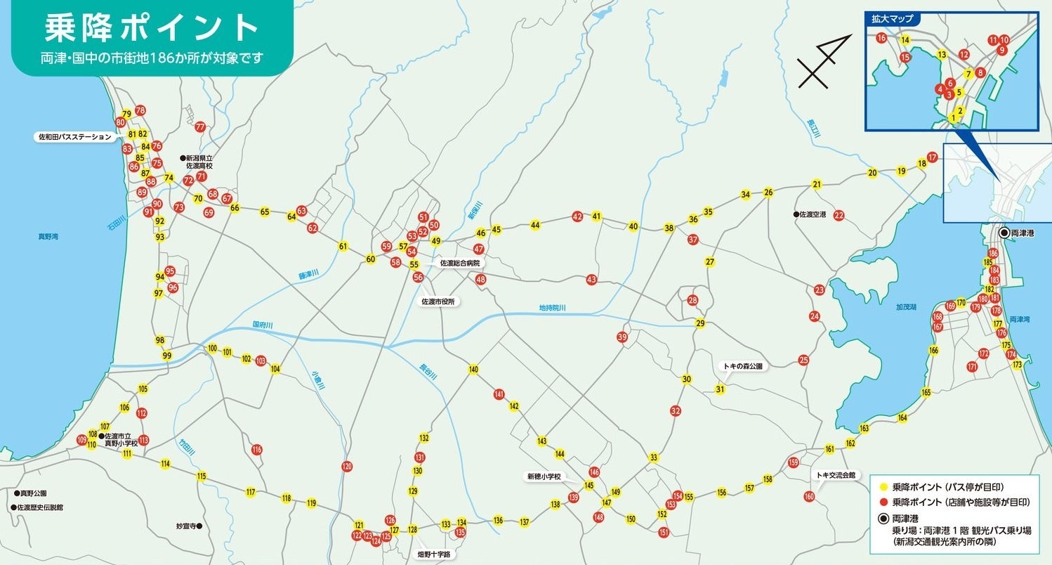乗降場所は島内の両津地区と国中地区の市街地エリアを対象に 186 か所設定しました。そのうち 98 か所は既存のバス停付近を、その他の88 か所は旅館・ホテルや店舗等の各種施設を目印として新たに設けています。これらの中からリクエストされた場所と両津港を結ぶ交通サービスを佐渡汽船の船便ごとに運行することで、高い利便性を実現します。