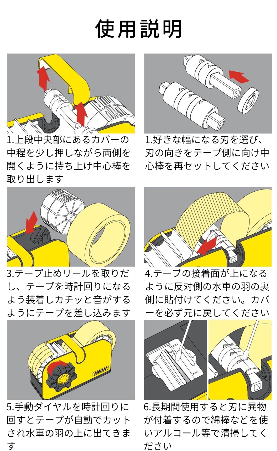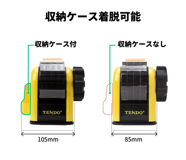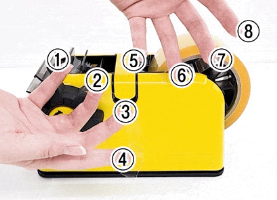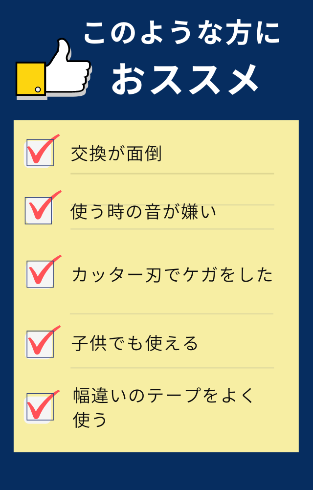 1.多刃細断機能 2.コストカット 3.TPEダイヤル 4.GOOD DESIGN 5.直線カット機能 6.最大テープ容量80m 7.内蔵カッター 8.静音テープ1本付属