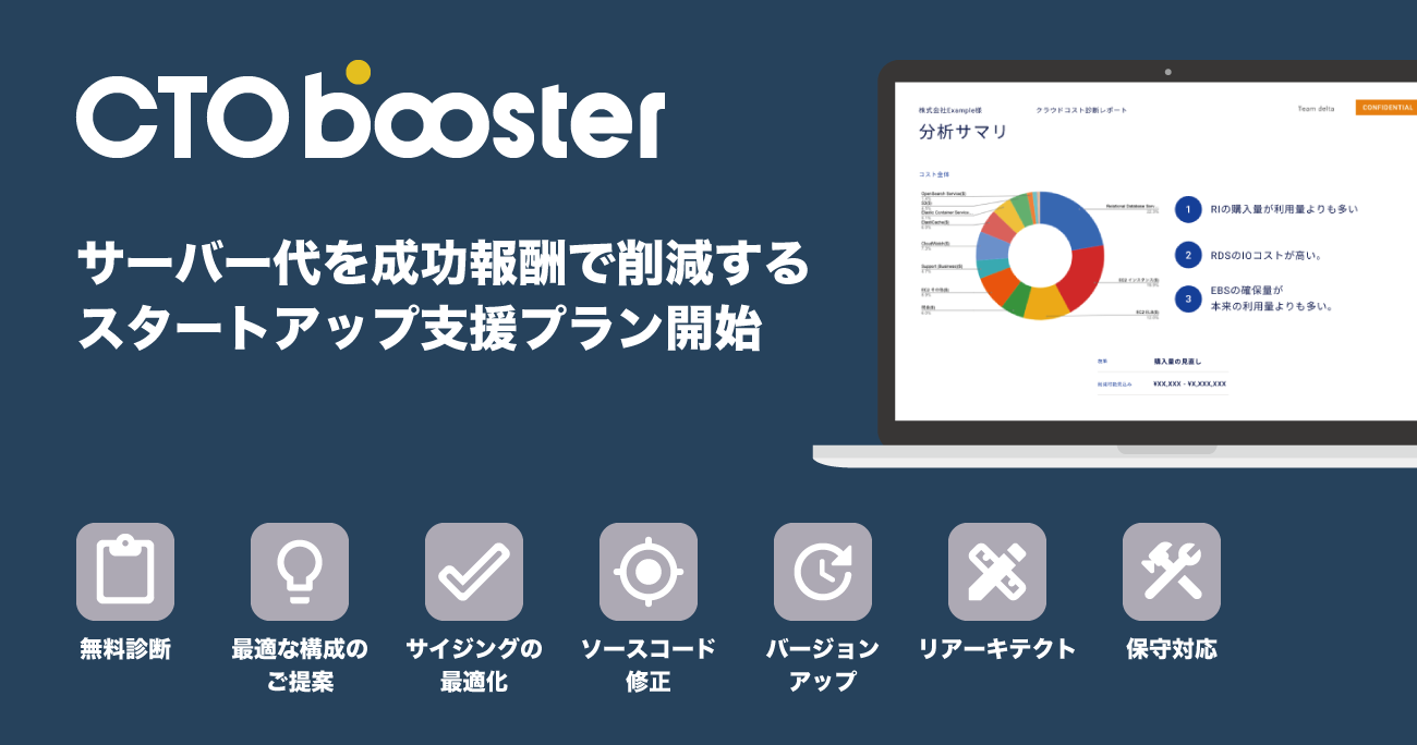 当社が提供する「CTO Booster」は、サーバー代にいくらの削減余地があるかの調査から実際の削減作業までのすべてを成功報酬の範囲内で依頼できるサービスです。実際に削減できた金額からしか報酬は発生しないため、削減余地があるかの調査の段階から依頼がしやすい上、追加の予算を用意する必要がありません。また、現在のサーバー代にどれくらいの削減余地があるかを予測する診断は無料で提供しています。