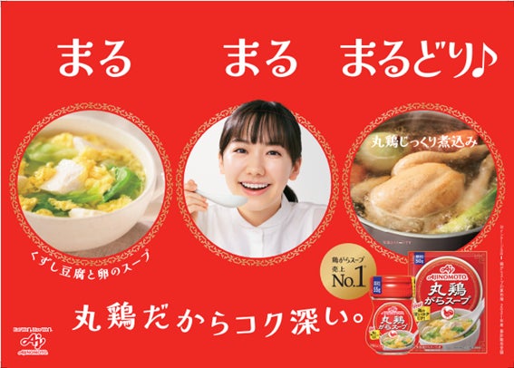 今年で発売29年目を迎える「丸鶏がらスープ™」は、おいしさをさらに向上させた5年ぶりのリニューアルに合わせてTVCMを刷新します。新TVCMのイメージキャラクターには、ご家庭でも普段から「丸鶏がらスープ™」を愛用されている俳優の芦田愛菜さんを起用しました。メッセージは「丸鶏だからコク深い。」。鶏を丸ごとじっくり煮込んでいるからこそ生まれる「丸鶏がらスープ™」ならではの豊かな鶏の風味とコク深いおいしさを、つい口ずさみたくなる新コマーシャルソング「丸うた」にのせて伝えています。